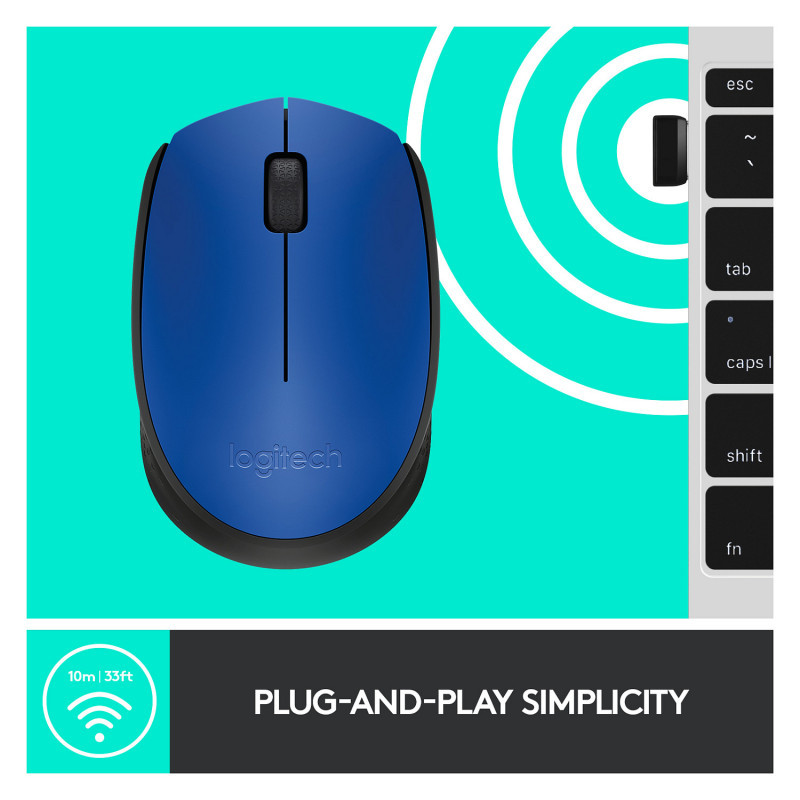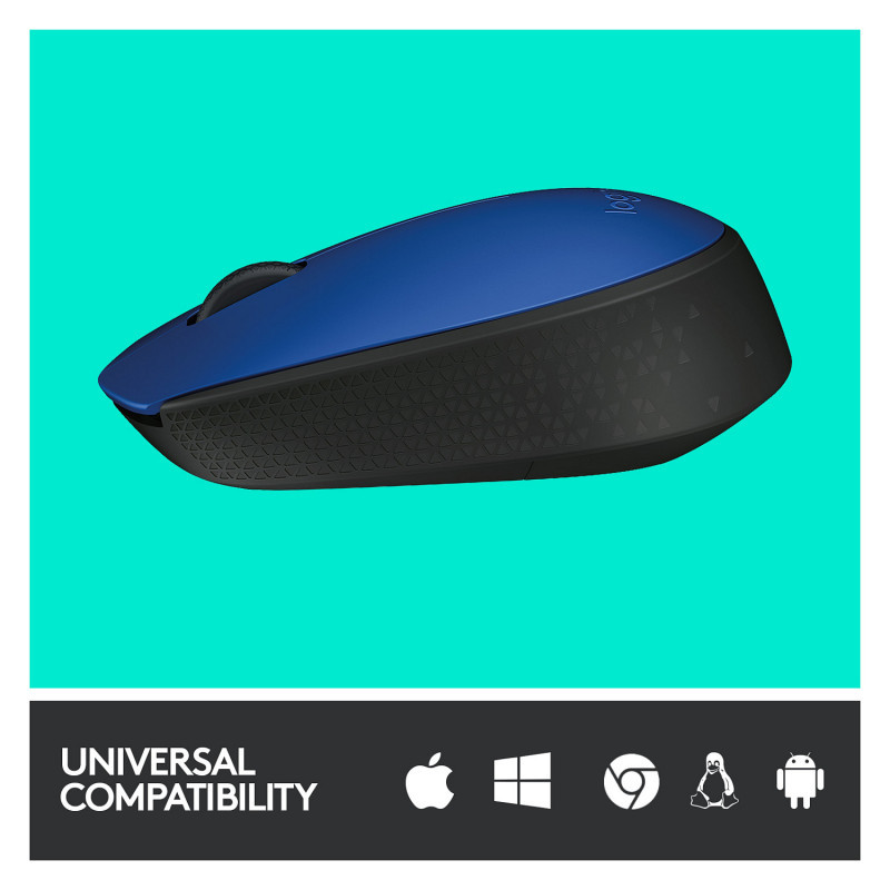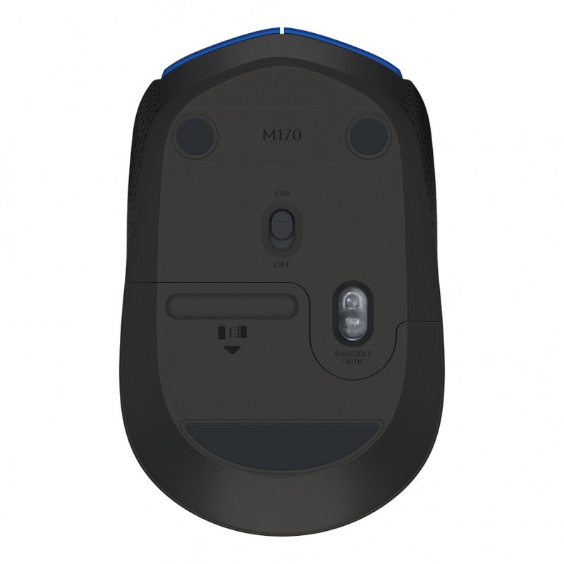 "Logitech M170 Wireless Mouse. Form factor: Ambidextrous. Movement detection technology: Optical, Device interface: RF Wireless, Movement resolution: 1000 DPI, Buttons type: Pressed buttons, Buttons quantity: 2, Scroll type: Wheel. Power source: Batteries. Product colour: Black, Blue"\n"NOW IS WIRELESS. With Logitech® M171 Wireless Mouse, choose the reliability of a cord with the convenience of wireless – and a 10-metre (33-foot) range – thanks to Logitech Advanced 2.4 GHz wireless technology. This affordable mouse works for 12 months* on a single AA battery. Set up is simple – just plug the tiny wireless receiver into a USB slot. There's no hassle with pairing or software installation, and M171 is compatible with Windows®, Mac and Chrome™.