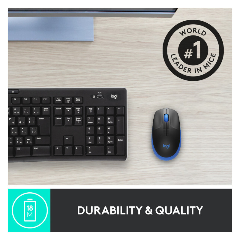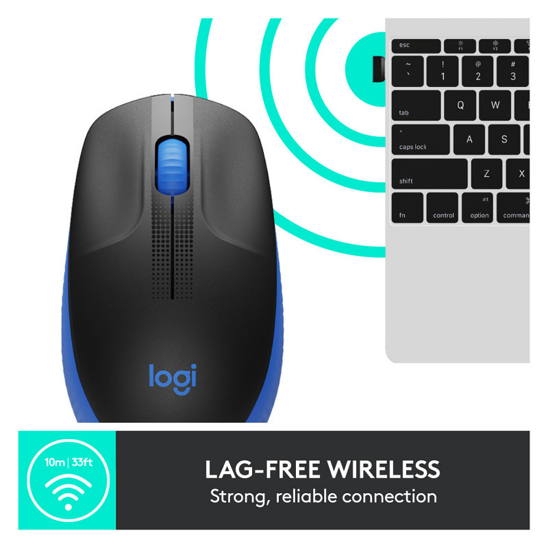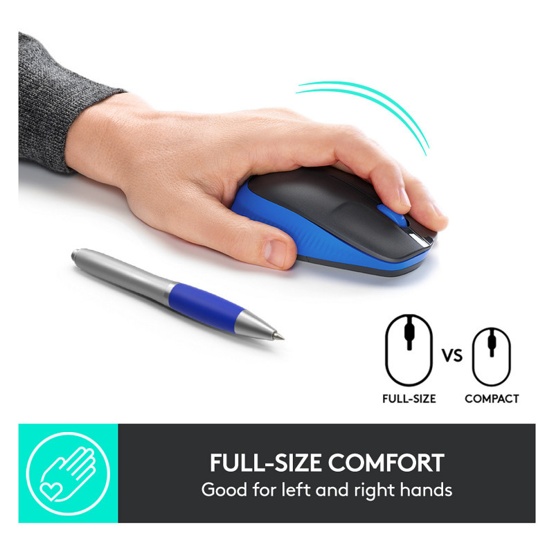 "Logitech M190 Full-size wireless mouse. Form factor: Ambidextrous. Movement detection technology: Optical, Device interface: RF Wireless, Movement resolution: 1000 DPI, Buttons type: Pressed buttons, Buttons quantity: 3, Scroll type: Wheel. Power source: Batteries. Product colour: Blue"\n