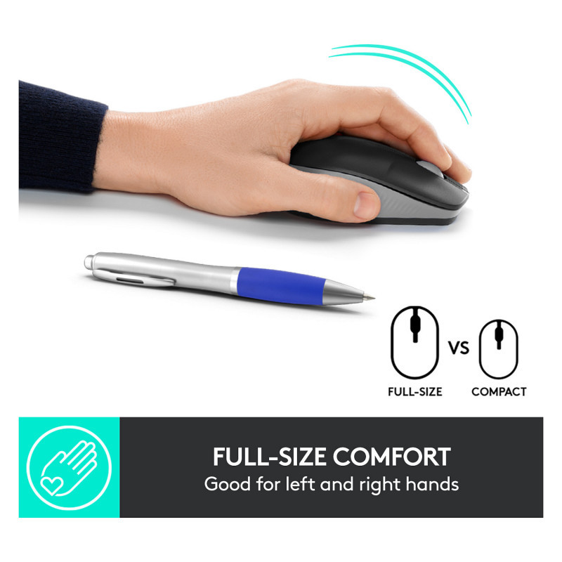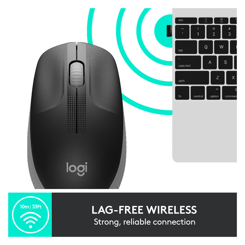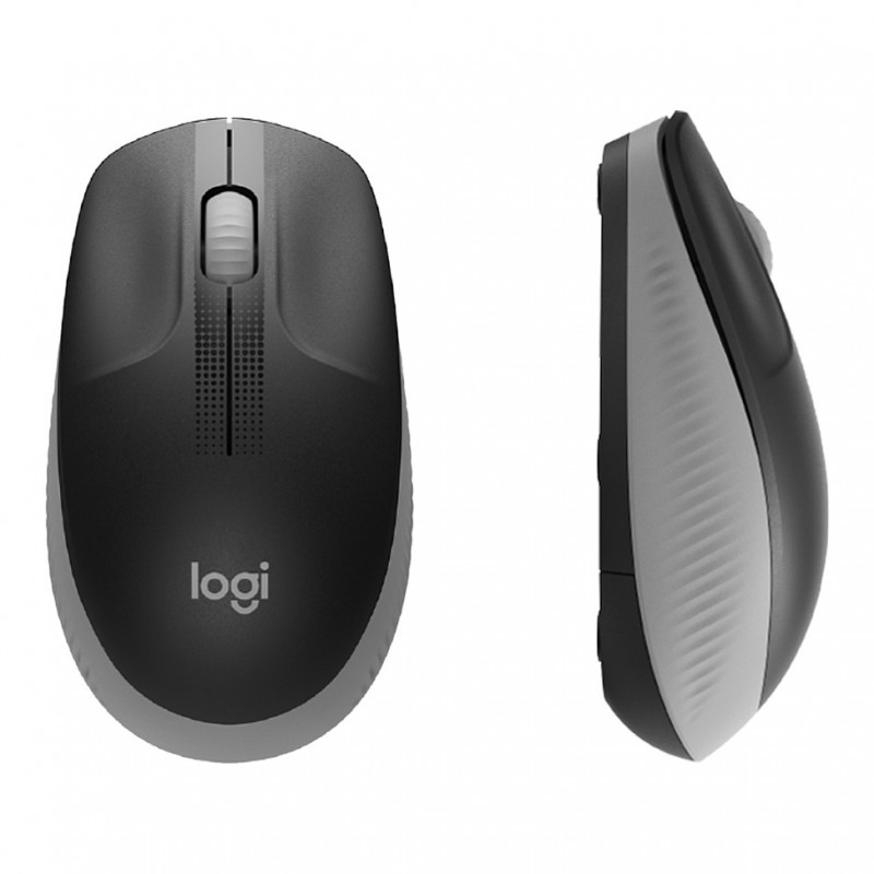 "Logitech M190 Full-size wireless mouse. Form factor: Ambidextrous. Movement detection technology: Optical, Device interface: RF Wireless, Movement resolution: 1000 DPI, Buttons type: Pressed buttons, Buttons quantity: 3, Scroll type: Wheel. Power source: Batteries. Product colour: Grey"\n