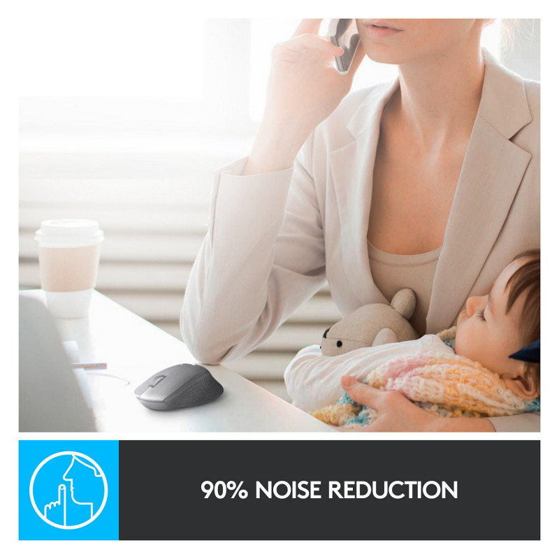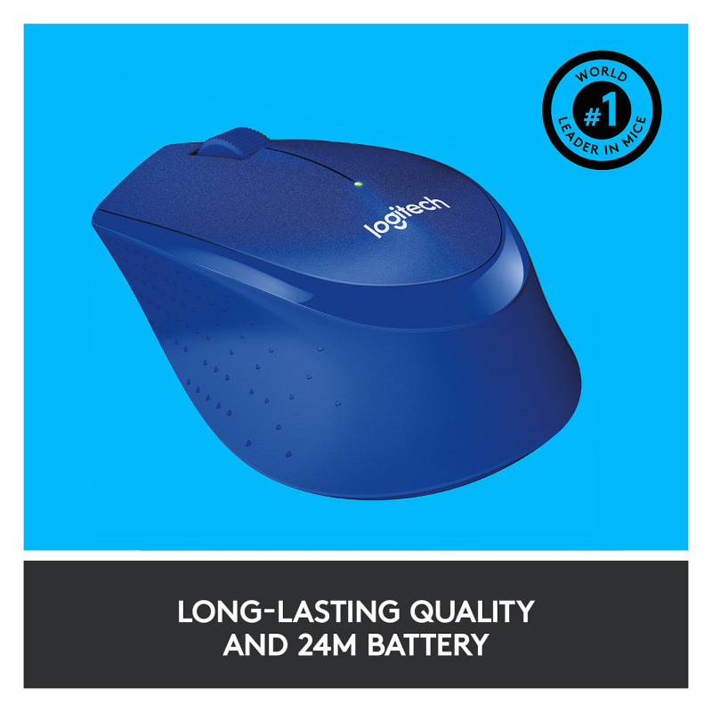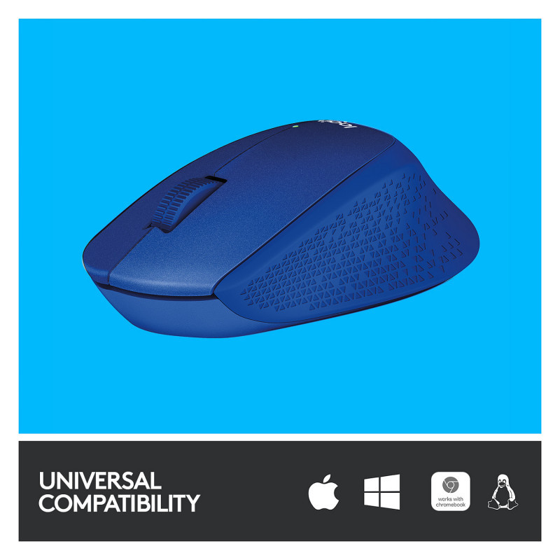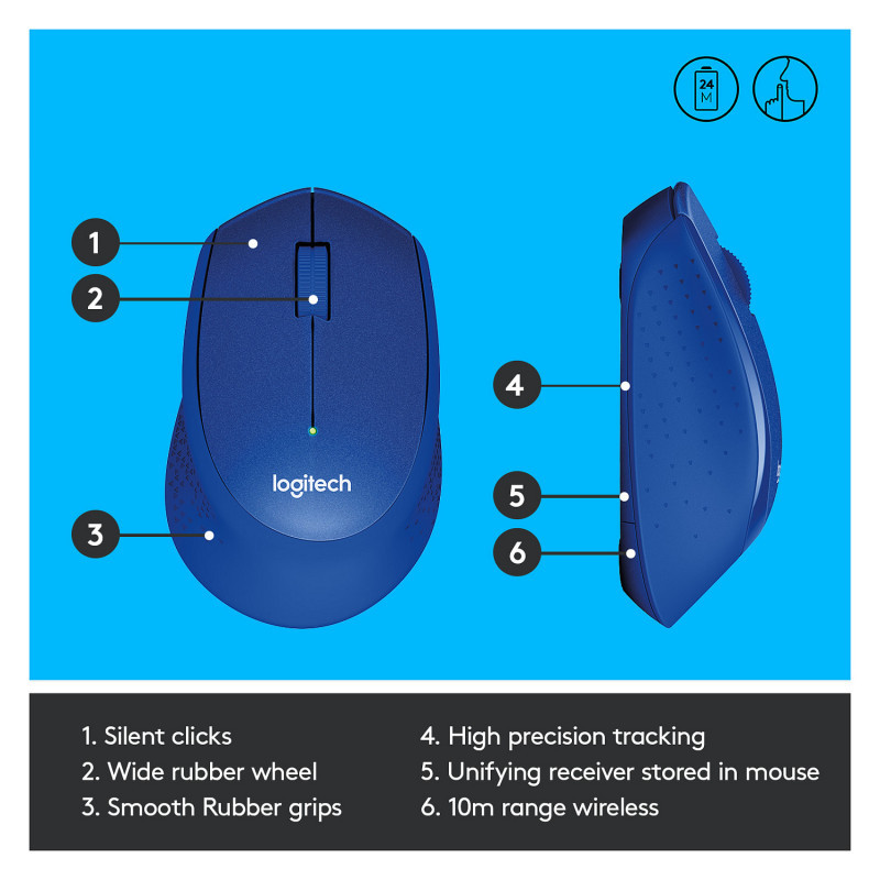 "Logitech M330 SILENT PLUS. Form factor: Right-hand. Movement detection technology: Optical, Device interface: RF Wireless, Movement resolution: 1000 DPI, Buttons type: Pressed buttons, Buttons quantity: 3, Scroll type: Wheel. Power source: Batteries. Product colour: Blue"\n"With the same click feel and over 90% noise reduction* compared to classic mice, M330 SILENT PLUS offers a quiet experience for yourself and those around you. It has a long-lasting 24-month battery life with auto-sleep and a powerful 10-meter wireless range**. Plus, it’s designed with contoured grips made of soft rubber for total comfort. Just plug the tiny USB receiver and it works with Windows®, Mac, ChromeOS™ or Linux®. Finally, the Logitech® Advanced Optical Tracking guarantees smooth and precise moves on almost any surface.