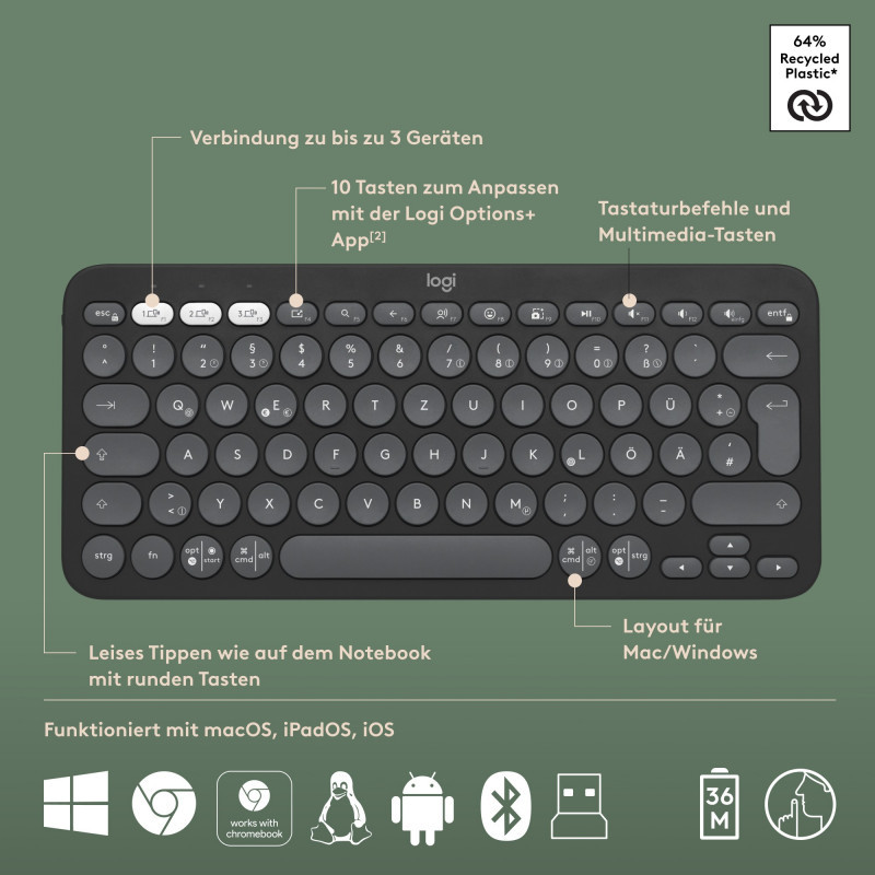 "Logitech 920-012203. Keyboard form factor: Mini. Keyboard style: Straight. Connectivity technology: Wireless, Device interface: RF Wireless + Bluetooth, Keyboard key switch: Scissor key switch, Keyboard layout: QWERTZ, Recommended usage: Universal. Product colour: Graphite. Mouse included"\n"HOW YOU EXPRESS YOURSELF IS UP TO YOU