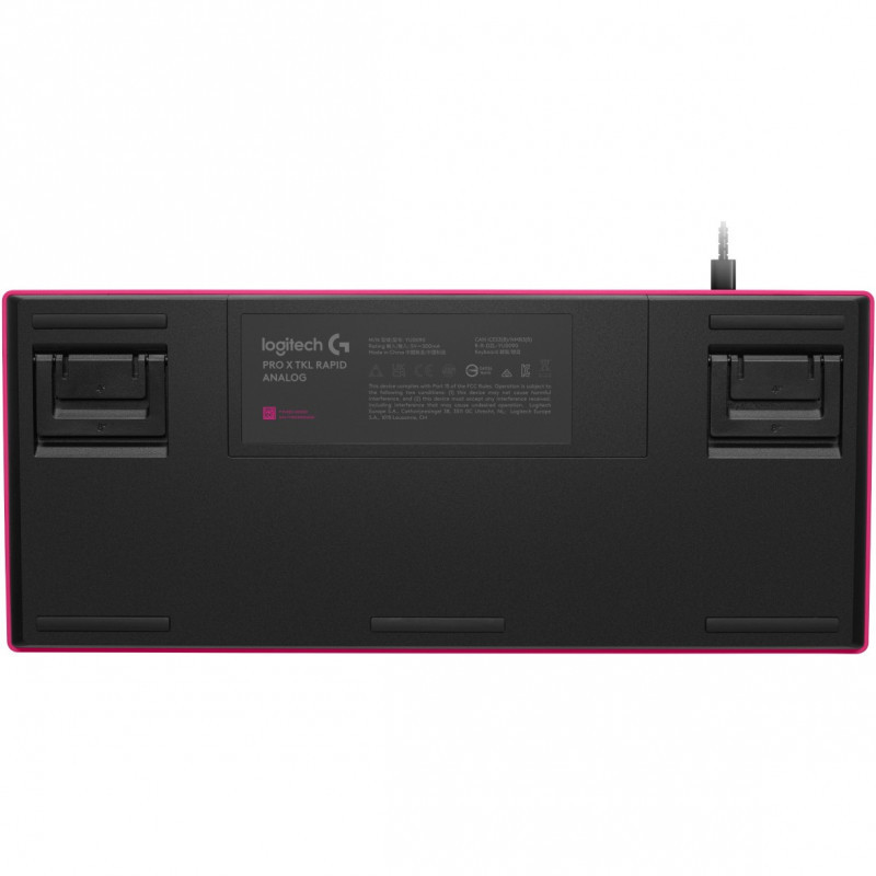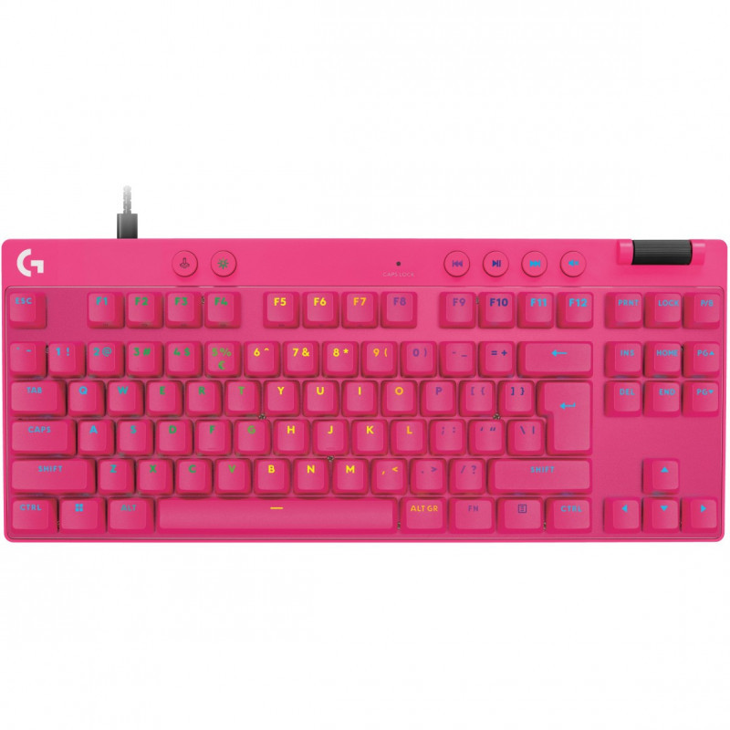 "Logitech G PRO X TKL Rapid. Keyboard form factor: Tenkeyless (80 - 87%). Keyboard style: Straight. Connectivity technology: Wired, Device interface: USB, Keyboard key switch: Magnetic-mechanical key switch, Keyboard layout: QWERTY. Backlight type: LED. Cable length: 1.8 m. Recommended usage: Gaming. Product colour: Pink"\n