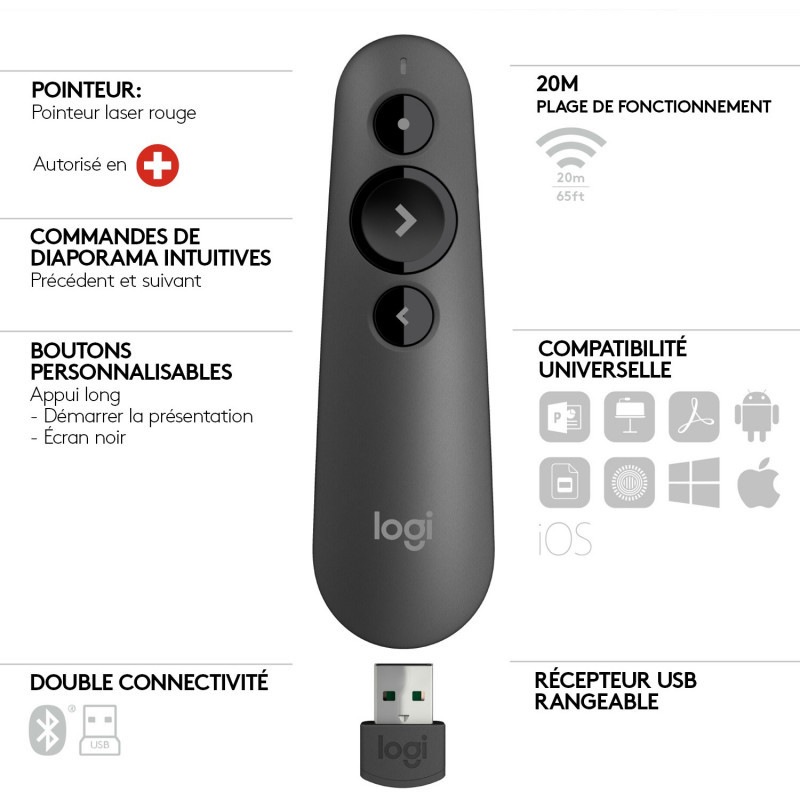 "Logitech R500 Laser Presentation Remote. Wireless receiver interface: USB, Wireless technology: Bluetooth/RF, Receiver type: Nano receiver. Product colour: Graphite, Presenter functions: Laser pointer, Remote control, Laser pointer colour: Red. Battery technology: Alkaline, Battery capacity: 1000 mAh, Battery type: AAA. Windows operating systems supported: Windows 10, Windows 11, Windows 7, Windows 8, Windows 8.1, Mac operating systems supported: Mac OS X 10.12 Sierra, Mac OS X 10.13 High Sierra, Mac OS X 10.14 Mojave, Mac OS X 10.15 Catalina,.... Receiver width: 1.75 cm, Receiver depth: 2.5 cm, Receiver height: 6.6 mm"\n"Introducing the R500, a plug-and-play presentation remote that allows you to navigate slides and laser point from up to 20 meters (65 feet) away. Deliver your presentation with ease and confidence thanks to the unmistakable three-button design and R500’s comfortable, secure fit in hand. The R500 is optimized for most devices and popular presentation software – and you can customize buttons, check battery life, and set an on-screen timer in the Logitech Presentation App.