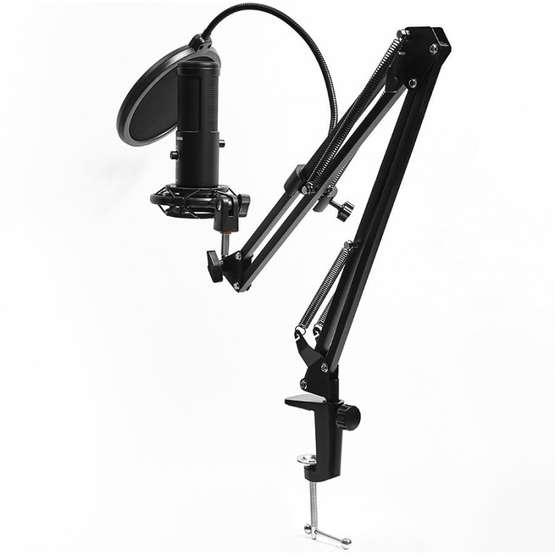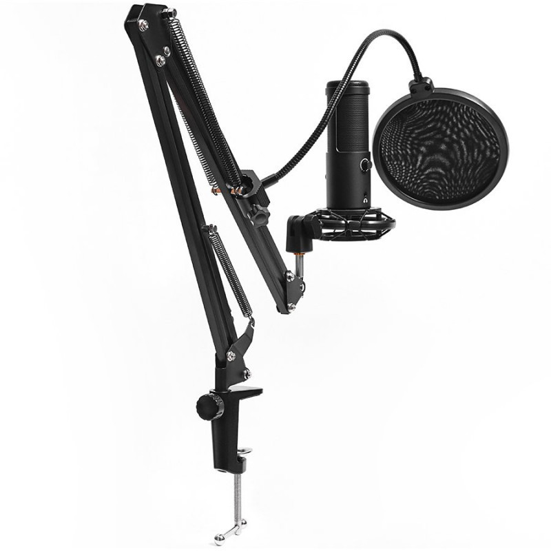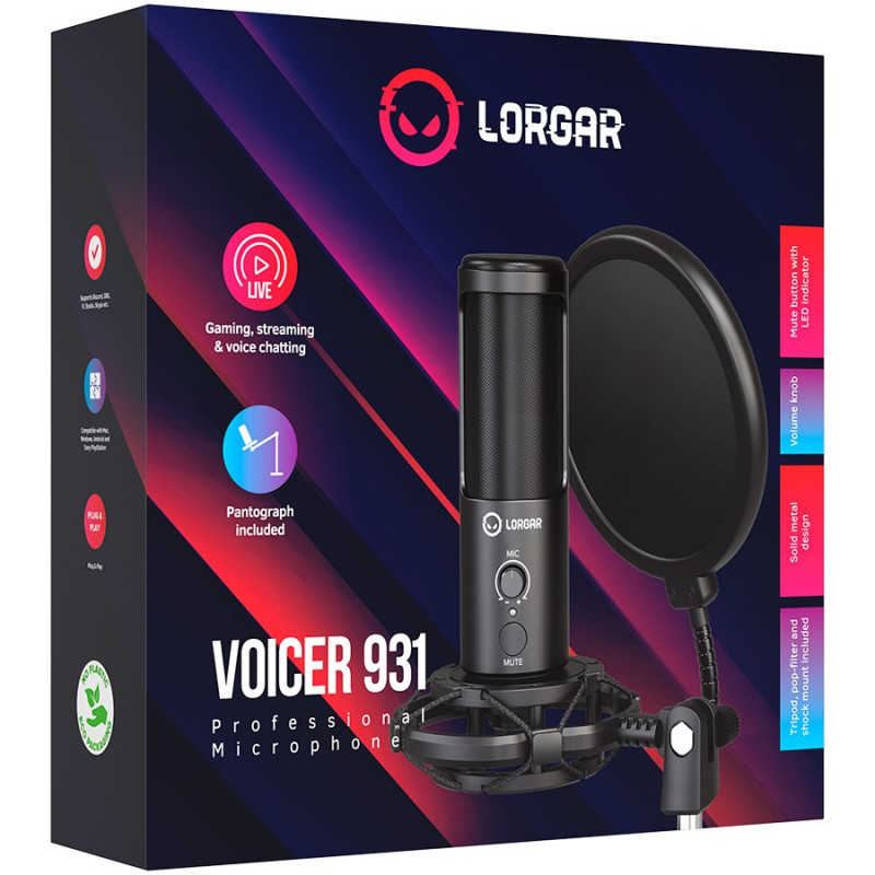 LORGAR Voicer 931, Gaming Microphone, Black, USB condenser microphone with boom arm stand, pop filter, tripod stand. including 1* microphone, 1*Boom Arm Stand with C-clamp, 1*shock mount, 1*pop filter, 1*windscreen cap, 1*2.5m type-C USB cable, 1* Extra tripod