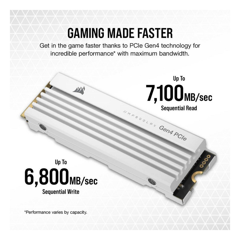 "Corsair MP600 PRO LPX. SSD capacity: 4 TB, SSD form factor: M.2, Read speed: 7100 MB/s, Write speed: 6800 MB/s, Component for: Game console"\n"A PERFECT FIT FOR YOUR PS5