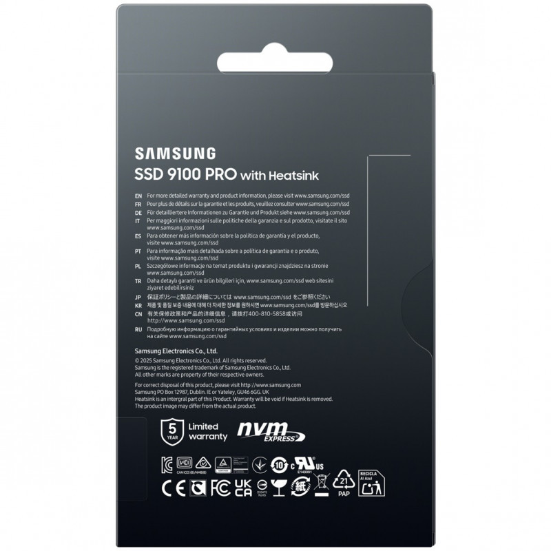 "Samsung 9100 PRO Heatsink PCIe® 5.0 NVMe™ M.2 SSD - 4 TB. SSD capacity: 4 TB, SSD form factor: M.2, Read speed: 14800 MB/s, Write speed: 13400 MB/s, Component for: PC/Game console"\n"Breakthrough PCIe® 5.0 performance