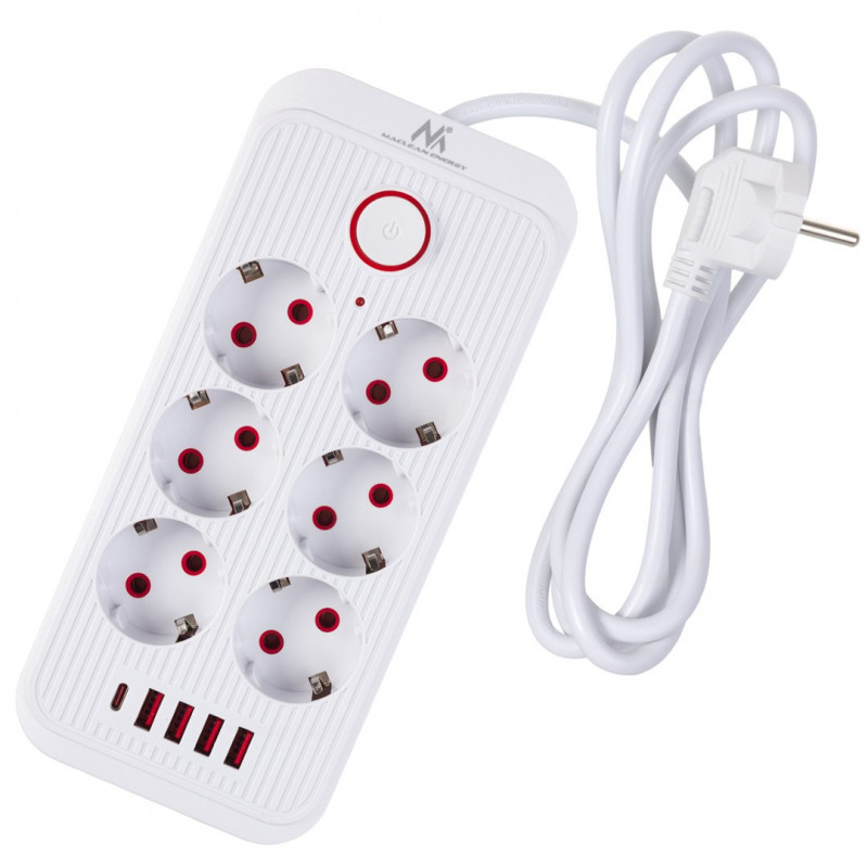Maclean elektros paskirstytuvas, 6 lizdai + 4xUSB prailginimo laidas, 110–240 V kintama srovė, 50/60 Hz, 2,1 A, maks. 2500 W, 1,5 m, baltas, MCE389 W