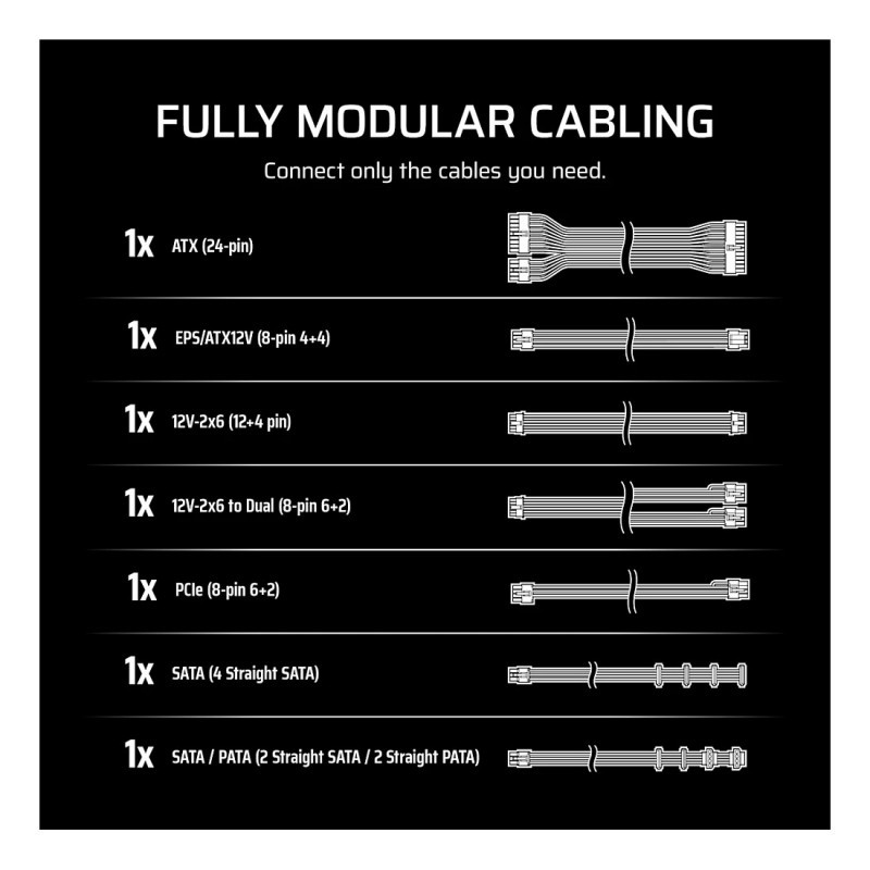 PCIe 5.1 12V-2x6 GPU cables included for use with modern and next-gen graphics cards.