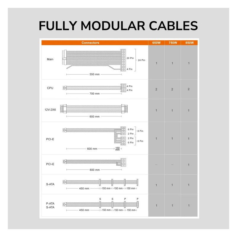 The COUGAR GR series supports the latest PCIe 5.1 specification: its powerful and stable performance meets the needs of next-generation GPUs, delivering perfect power for next-gen graphics cards. Equipped with a modular native PCIe 12V-2X6 connector, the 600mm length provides sufficient slack to reduce the risk of faulty connection during PC installation, without the need for a 6+2 pin adaptor.