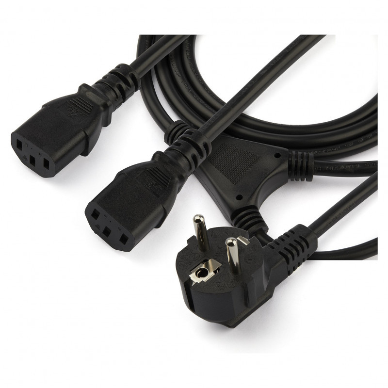 "StarTech.com 2m (6ft) Computer Power Y Cord, 18AWG, EU Schuko to 2x C13, 10A 250V, Black Replacement AC Power Cord, Printer Power Cord, PC Power Supply Cable, Monitor Power Cable - UL Listed. Cable length: 2 m, Connector 1: CEE7/7, Connector 2: 2 x C13 coupler. Input voltage: 250 V, Input current: 10 A"\n"2m (6ft) Computer Power Y Cord, EU Schuko Plug to C13, 10A 250V, 18AWG