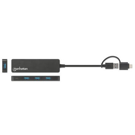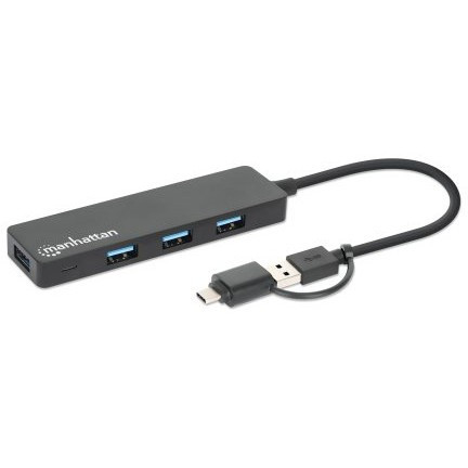 "Manhattan USB-C & USB-A Combo Dock/Hub, Ports (4): USB-A (x4), 5 Gbps (USB 3.2 Gen1 aka USB 3.0), External Power Supply Not Needed, Universal for all devices, SuperSpeed USB, Black, Three Year Warranty. Host interface: USB 3.2 Gen 1 (3.1 Gen 1) Type-A + Type-C, Hub interfaces: USB 3.2 Gen 1 (3.1 Gen 1) Type-A. Data transfer rate: 5000 Mbit/s, Product colour: Black, Housing material: Acrylonitrile butadiene styrene (ABS). Output voltage: 5 V, Output current: 0.9 A. Windows operating systems supported: Windows 10, Windows 11, Windows 7, Windows 8.1, Windows Vista, Windows XP, Other operating systems supported: ChromeOS. Width: 30 mm, Depth: 107 mm, Height: 11 mm"\n"4 Port USB 3.0 Hub with Type C and Type A plug for more ways to connect your USB-A devices