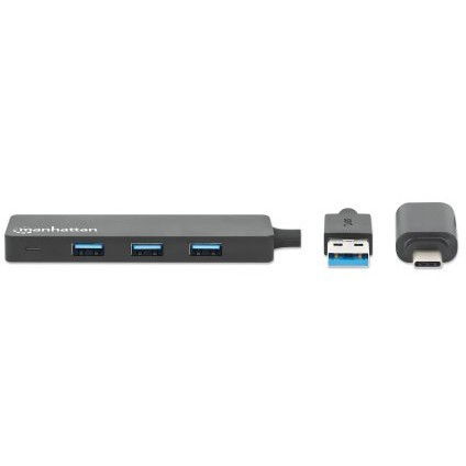 The Manhattan 4-Port USB 3.0 Type-C / Type-A Combo Hub turns one of your device's USB ports into four USB-A ports, so you can easily connect a keyboard, mouse, flash drive and more. Devices that fit the USB 3.2 Gen 1 spec (formerly known as USB 3.0) can reach transfer speeds up to 5 Gbps for external storage, printing and more. The Hub's SuperSpeed ports are backward compatible to run the older USB versions 2.0 or even 1.1. You can also charge your phone or tablet since the Hub supplies up to 5 V / 0.9 A of power.