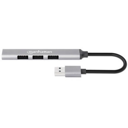 "Manhattan USB-A 4-Port Hub, 4x USB-A Ports (1x 5 Gbps USB 3.2 Gen1 aka USB 3.0, 3 x 480 Mbps USB 2.0), Bus Powered, Aluminium, Space Grey, Three Year Warranty. Host interface: USB 3.2 Gen 1 (3.1 Gen 1) Type-A, Hub interfaces: USB 2.0. Data transfer rate: 5000 Mbit/s, Product colour: Grey, Housing material: Aluminium. Output voltage: 5 V, Output current: 0.9 A. Windows operating systems supported: Windows 10, Windows 11, Windows 7, Windows 8.1, Other operating systems supported: ChromeOS. Width: 17 mm, Depth: 101 mm, Height: 7 mm"\n"4-Port USB Hub with Type-A plug for more ways to connect your USB-A devices