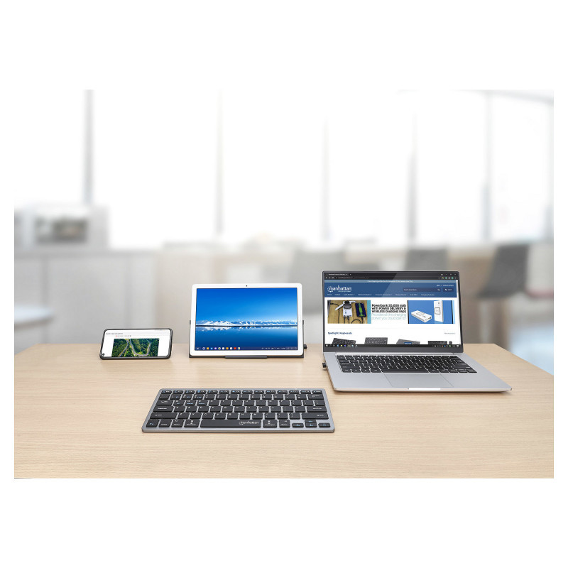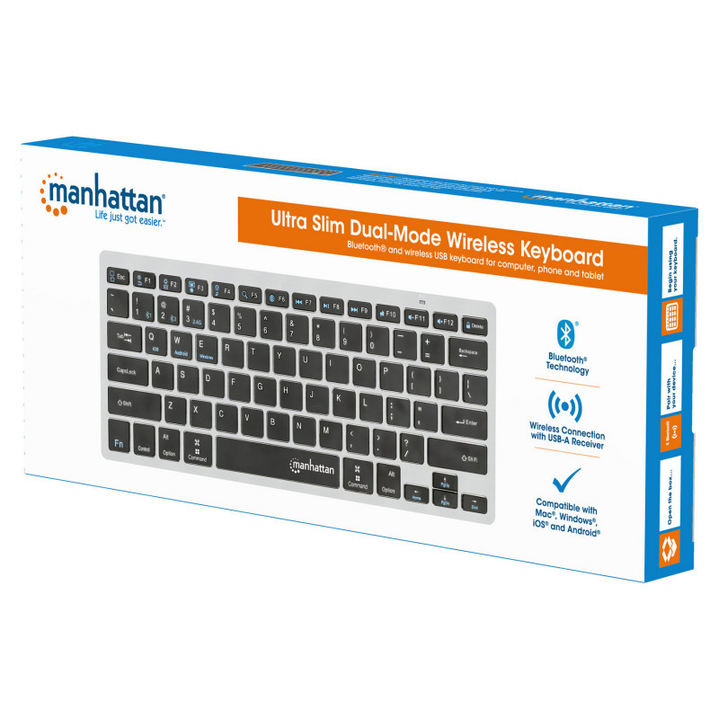 Use one keyboard for all your devices with the Manhattan Ultra Slim Dual-Mode Wireless Keyboard. It connects up to three devices such as PC, Macbook®, Chromebook®, iPad® Pro or smartphone simultaneously: two via Bluetooth and one via its 2.4 GHz USB-A micro receiver. With just the touch of a button, you can easily switch between them (for example, from your phone to write a WhatsApp text and back to your notebook to write an email).