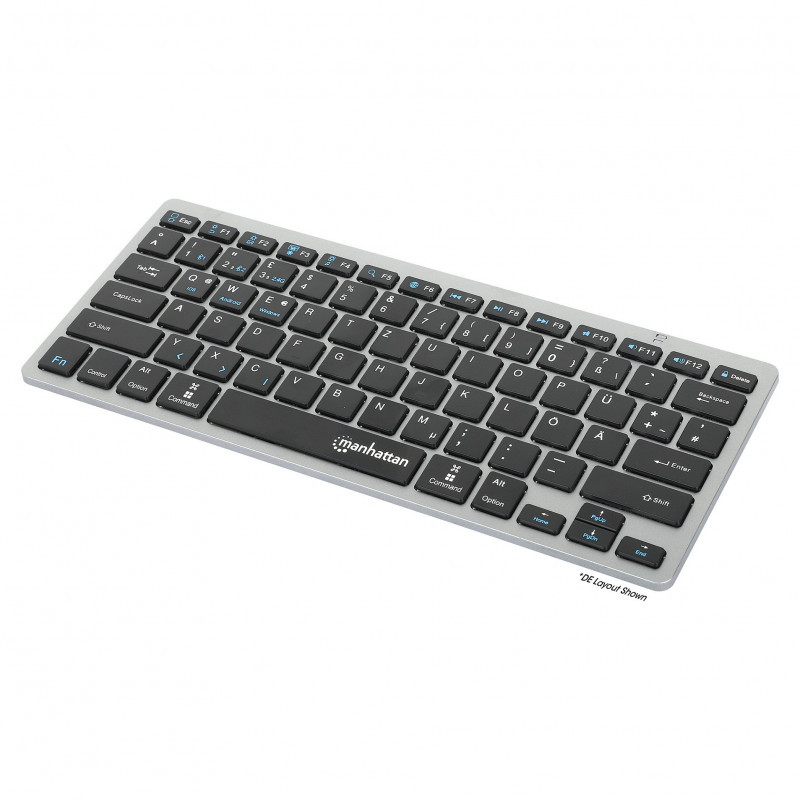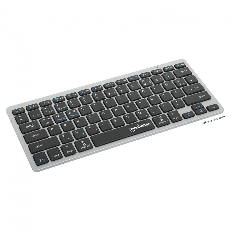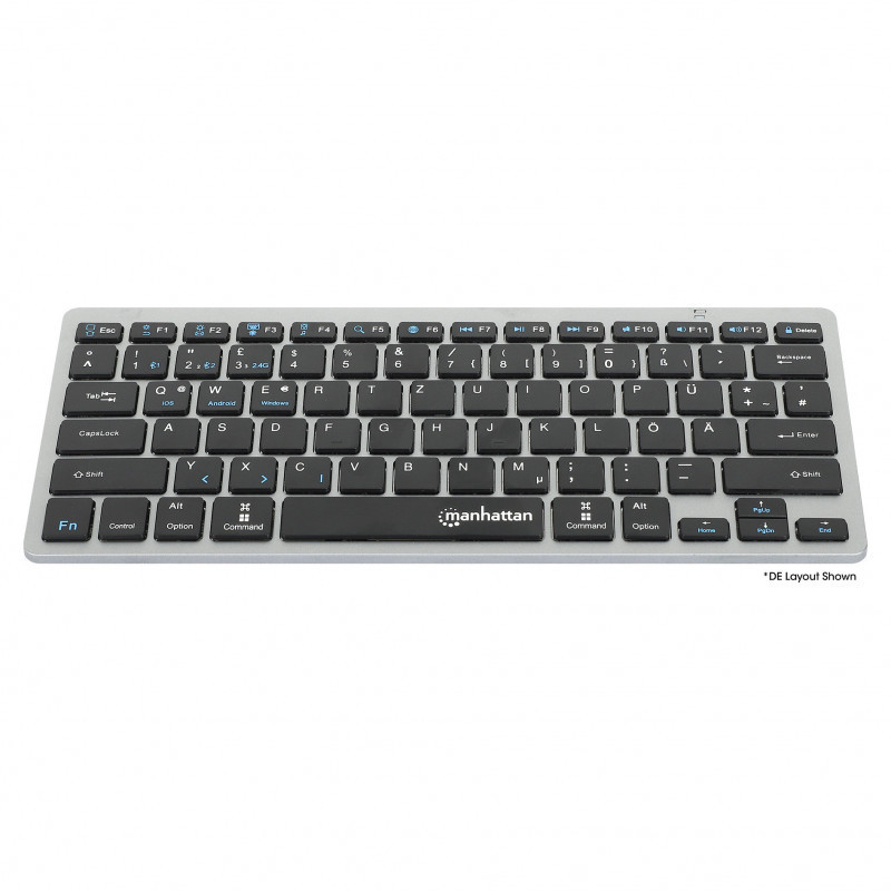 "Manhattan Ultra Slim Dual-Mode Wireless Keyboard, German Quertz layout, Bluetooth (v3.0) and Wireless (2.4GHz), 78 low profile scissor keys, Auto Power Management, Range 10m, USB-A Micro Receiver, AAA Battery (included), Windows and Mac, Three Year Warranty. Keyboard form factor: Mini. Keyboard style: Straight. Connectivity technology: Wireless, Device interface: RF Wireless + Bluetooth, Keyboard key switch: Scissor key switch, Keyboard layout: QWERTZ, Keyboard number of keys: 78, Recommended usage: Office. Product colour: Black, Grey"\n"Bluetooth keyboard and wireless USB keyboard for PC, phone and tablet