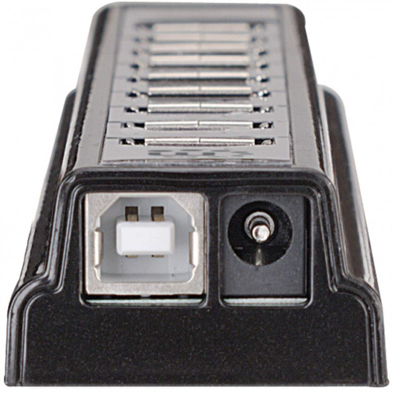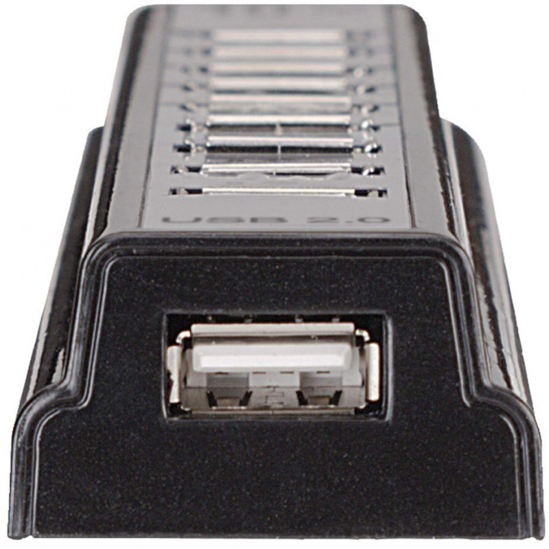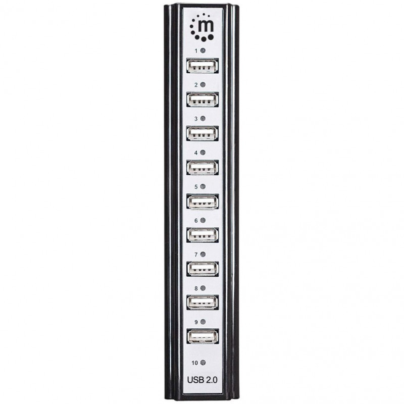 "Manhattan USB-A 10-Port Desktop Hub, 10x USB-A Ports, 480 Mbps (USB 2.0), Bus or AC Power, Hi-Speed USB, Black, Three Year Warranty. Host interface: USB 2.0, Hub interfaces: USB 2.0. Data transfer rate: 480 Mbit/s, Product colour: Black, Silver, Housing material: Plastic. Input voltage: 100 - 240 V, Input current: 0.4 A, AC input frequency: 50 - 60 Hz. Width: 37 mm, Depth: 21 mm, Height: 190 mm. Cables included: USB"\n"- Provides 10 Hi-Speed USB ports for additional peripherals