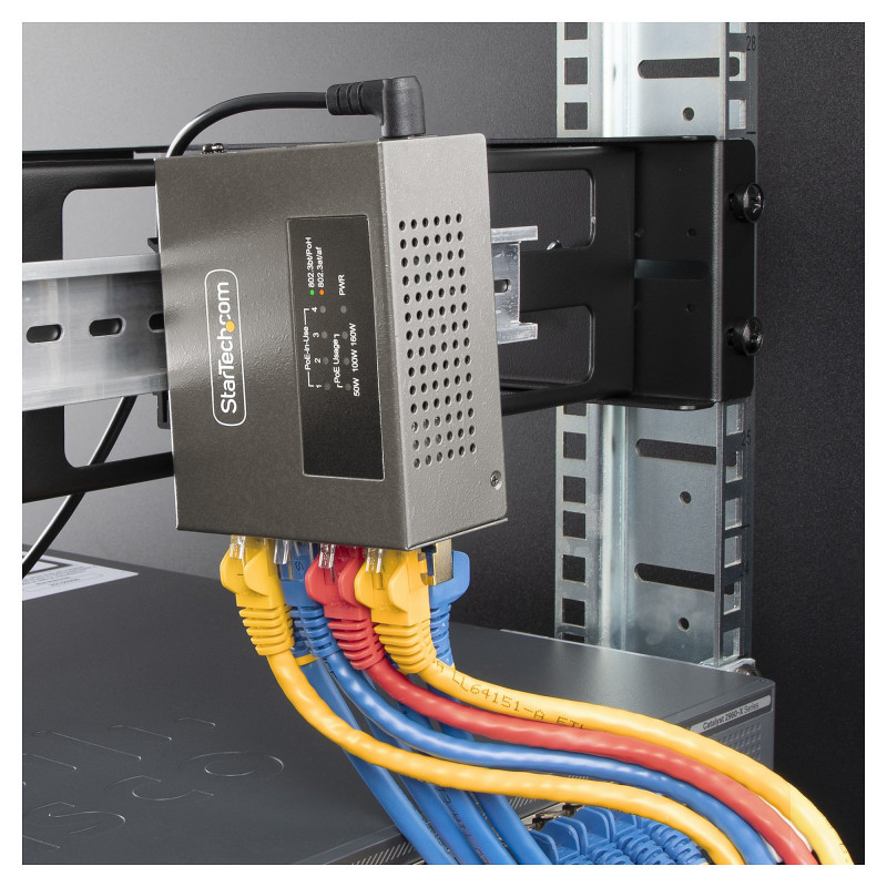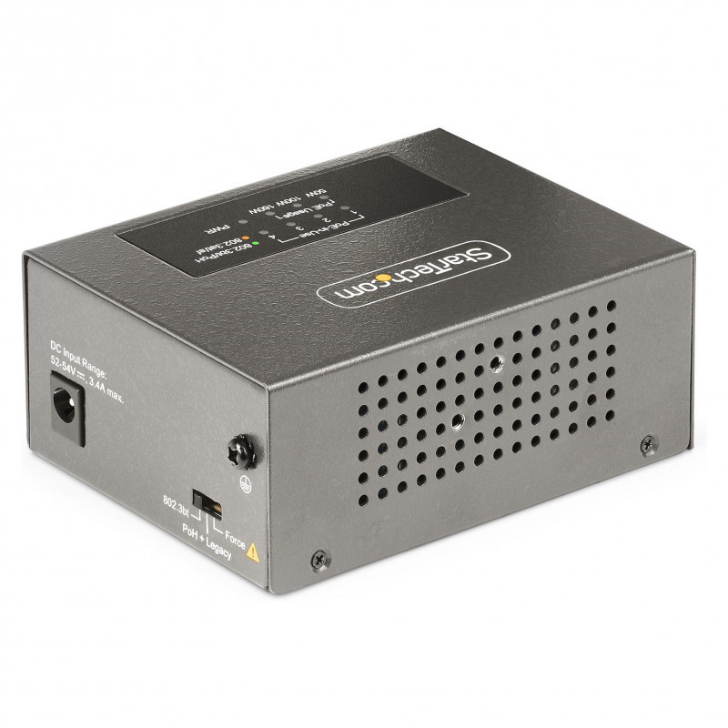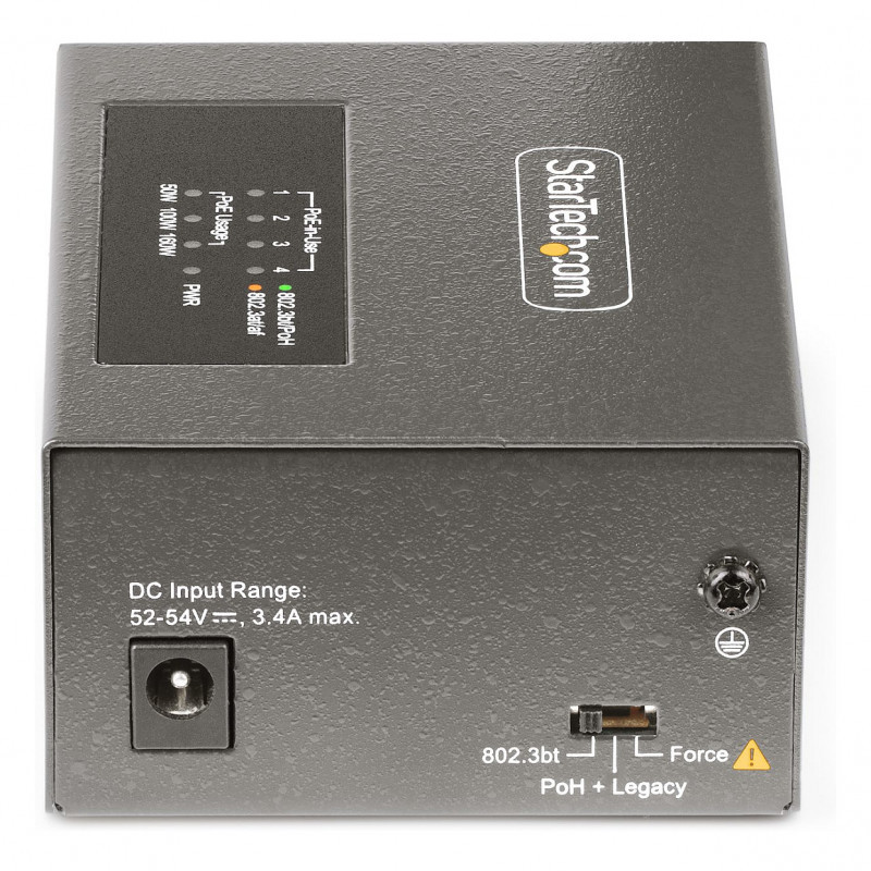 "StarTech.com 4-Port Multi-Gigabit PoE++ Injector, 5/2.5/1G Ethernet (NBASE-T), PoE/PoE+/PoE++ (802.3af/802.3at/802.3bt), 160Watts Power Budget, Wall/DIN Rail Mountable, Unmanaged. Ethernet interface type: 2.5 Gigabit Ethernet, 5 Gigabit Ethernet, Fast Ethernet, Gigabit Ethernet, Ethernet LAN data rates: 10,100,1000,2500,5000 Mbit/s, Networking standards: IEEE 802.3ab, IEEE 802.3af, IEEE 802.3at, IEEE 802.3bt, IEEE 802.3i, IEEE 802.3u. Product colour: Grey, Housing material: Metal, Maximum operating distance: 100 m. AC adapter input voltage: 100 - 240 V, Input current: 2.5 A, AC adapter output voltage: 54 V. Compliance certificates: CE, Federal Communications Commission (FCC), UKCA. Width: 70 mm, Depth: 94 mm, Height: 39 mm"\n"Supply power and data to up to four remote Powered Devices (PDs) with this PoE/PoE+/PoE++ injector