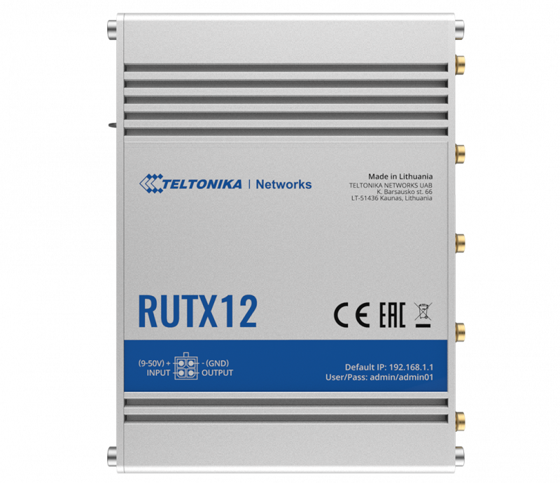 Dual LTE Cat 6 Router | RUTX12 | 802.11ac | 867 Mbit/s | 10/100/1000 Mbit/s | Ethernet LAN (RJ-45) ports 4 | Mesh Support No | MU-MiMO Yes | 4G | Antenna type 4xSMA for LTE, 2xRP-SMA for WiFi, 1xRP-SMA for Bluetooth, 1xSMA for GNNS | 1 x USB A