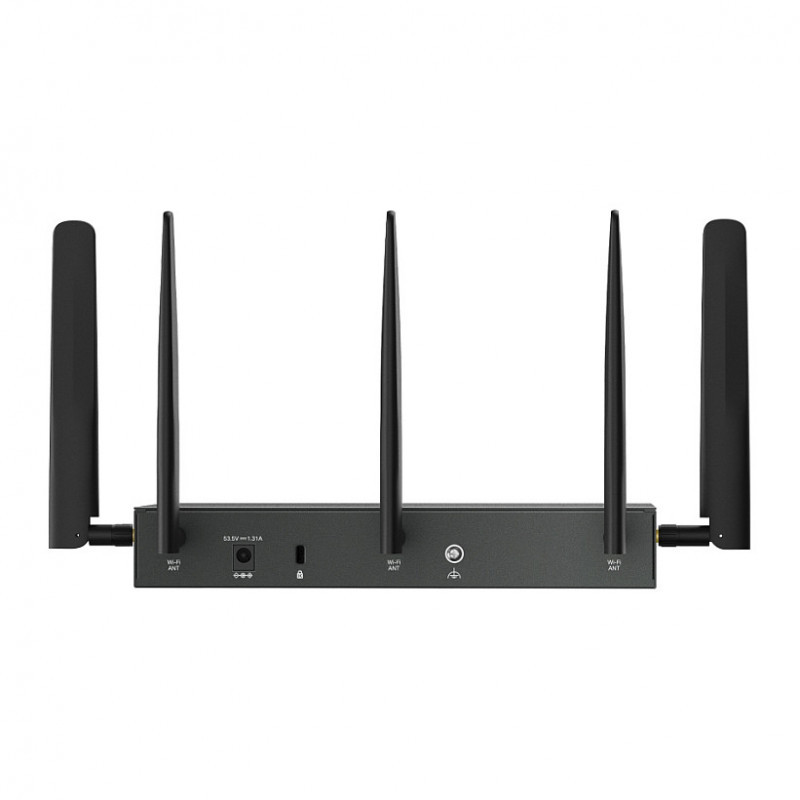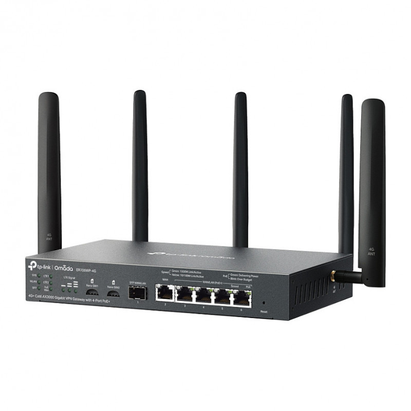 "TP-Link ER706WP-4G. WAN connection type: RJ-45. Wi-Fi band: Dual-band (2.4 GHz / 5 GHz), WLAN data transfer rate (max): 300 Mbit/s, Modulation: OFDMA. Ethernet LAN interface type: Gigabit Ethernet, Ethernet LAN data rates: 10,100,1000 Mbit/s, VPN support: IPsec VPN PPTP VPN L2TP VPN OpenVPN WireGuard VPN. Mobile network generation: 4G, 4G bands supported: 800,850,900,1500,1700,1800,1900,2000,2300,2400,2500,2600,3400,3500,3600,3700 MHz, SIM card type: NanoSIM. Security algorithms: IPSec, SNMP, SNMPv2, SNMPv3, WPA, WPA2, WPA3-Personal, NAT functionality: DHCP, PPPoE, L2TP, PPTP"\n"Ideal for Small Business Networking Use