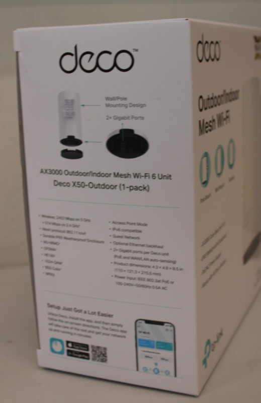SALE OUT. TP-LINK Deco X50-Outdoor AX3000 Outdoor Whole Home Mesh WiFi 6 Unit | SALE OUT. TP-LINK AX3000 Outdoor Whole Home Mesh WiFi 6 Unit | Deco X50-Outdoor | 802.11ax | 10/100/1000 Mbit/s | Ethernet LAN (RJ-45) ports 2 | Mesh Support Yes | MU-MiMO Yes | No mobile broadband | 24 month(s) | DAMAGED PACKAGING