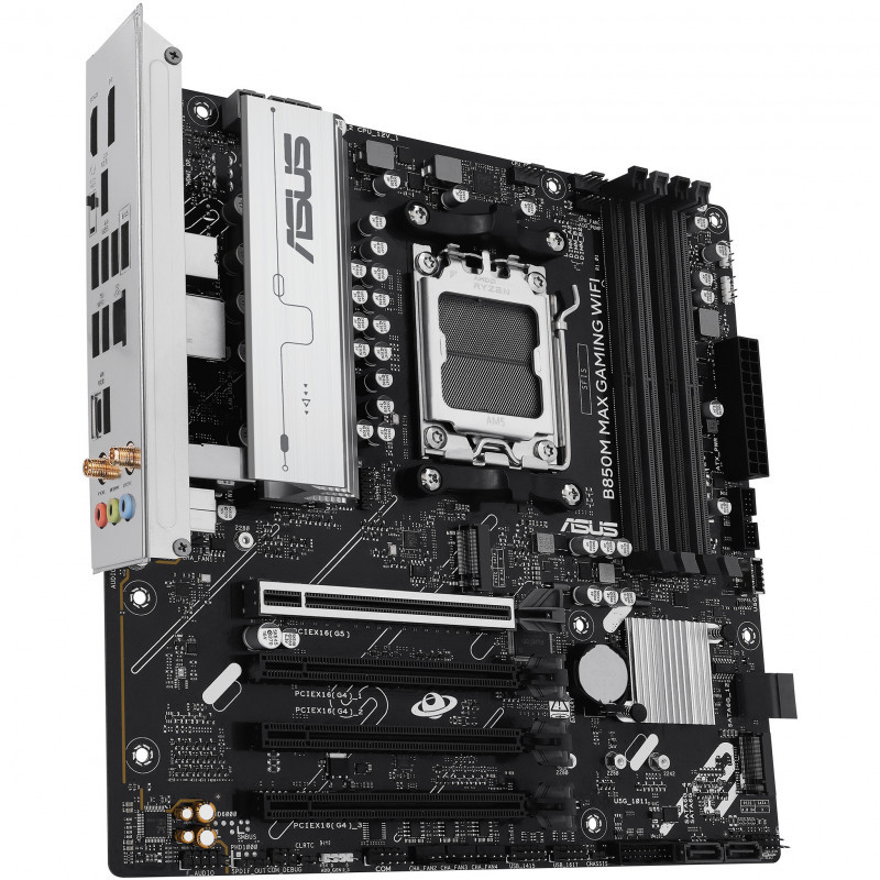 "ASUS B850M MAX GAMING WIFI. Processor manufacturer: AMD, Processor socket: Socket AM5, Compatible processor series: AMD Ryzen 7000 Series, AMD Ryzen 8000 Series, AMD Ryzen 9000 Series. Supported memory types: DDR5-SDRAM, Maximum internal memory: 256 GB, Memory slots type: DIMM. Supported storage drive interfaces: M.2, SATA III, Supported storage drive types: HDD & SSD, RAID levels: 0, 1, 5, 10. Ethernet interface type: Gigabit Ethernet, Top Wi-Fi standard: Wi-Fi 6 (802.11ax), Wi-Fi standards: Wi-Fi 6 (802.11ax). Component for: PC, Motherboard form factor: micro ATX, Motherboard chipset family: AMD"\n"B850M MAX GAMING WIFI