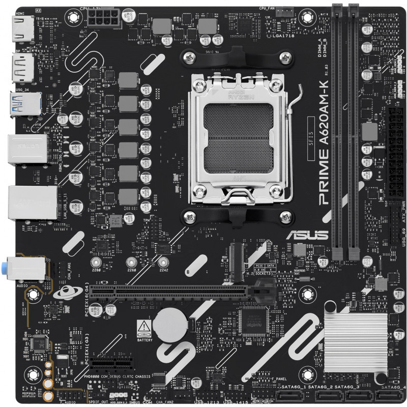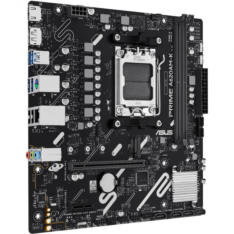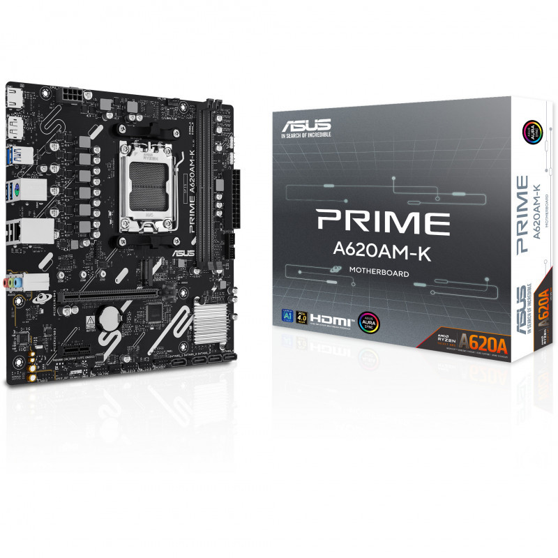 "ASUS PRIME A620AM-K. Processor manufacturer: AMD, Processor socket: Socket AM5, Compatible processor series: AMD Ryzen 7000 Series, AMD Ryzen 8000 Series, AMD Ryzen 9000 Series. Supported memory types: DDR5-SDRAM, Maximum internal memory: 128 GB, Memory slots type: DIMM. Supported storage drive interfaces: M.2, SATA III, Supported storage drive types: HDD & SSD, RAID levels: 0, 1, 5, 10. Ethernet interface type: Gigabit Ethernet. Component for: PC, Motherboard form factor: micro ATX, Motherboard chipset family: AMD"\n"A620AM-K