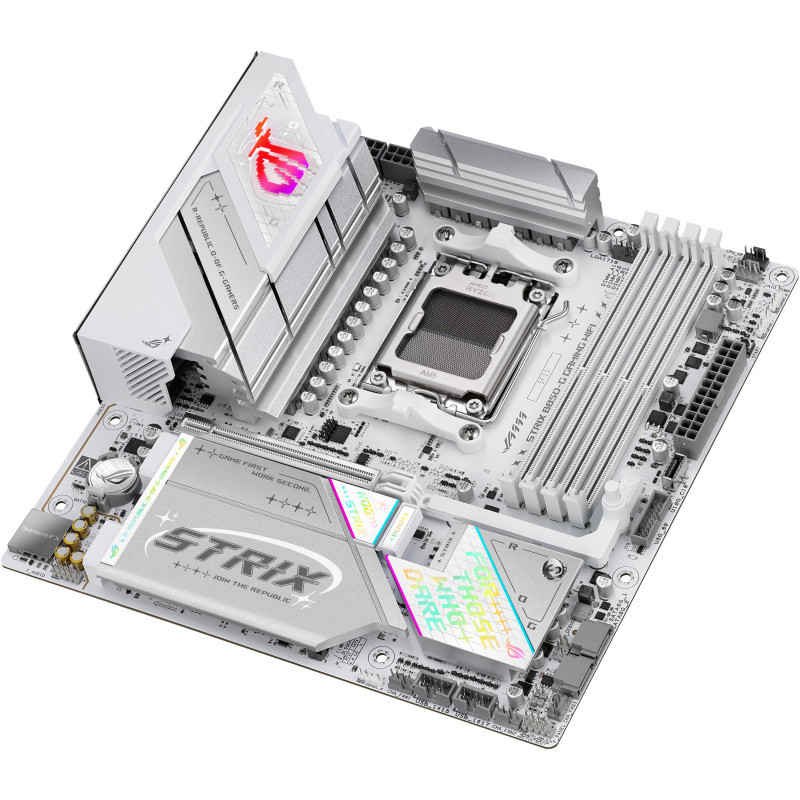 "ASUS ROG STRIX B850-G GAMING WIFI. Processor manufacturer: AMD, Processor socket: Socket AM5, Compatible processor series: AMD Ryzen 7000 Series, AMD Ryzen 8000 Series, AMD Ryzen 9000 Series. Supported memory types: DDR5-SDRAM, Maximum internal memory: 256 GB, Memory slots type: DIMM. Supported storage drive interfaces: M.2, SATA III, Supported storage drive types: HDD & SSD, RAID levels: 0, 1, 5, 10. Ethernet interface type: 2.5 Gigabit Ethernet, Top Wi-Fi standard: Wi-Fi 7 (802.11be), Wi-Fi standards: Wi-Fi 7 (802.11be). Component for: PC, Motherboard form factor: micro ATX, Motherboard chipset family: AMD"\n"ASUS ROG Strix B850-G Gaming WiFi AMD mATX motherboard, 14+2+1 power stages, DDR5 slots, four M.2 slots, PCIe® 5.0, WiFi 7, USB 20Gbps Type-C® and Aura Sync RGB"