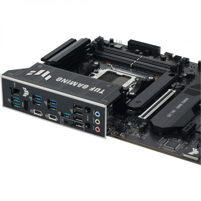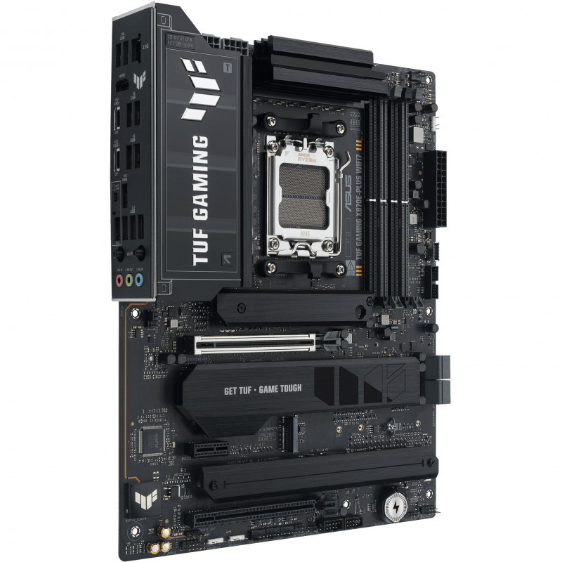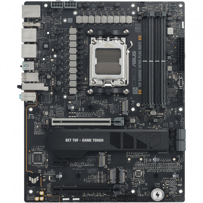 "ASUS TUF GAMING X870E-PLUS WIFI7. Processor manufacturer: AMD, Processor socket: Socket AM5, Compatible processor series: AMD Ryzen 7000 Series, AMD Ryzen 8000 Series, AMD Ryzen 9000 Series. Supported memory types: DDR5-SDRAM, Maximum internal memory: 256 GB, Memory slots type: DIMM. Supported storage drive interfaces: M.2, PCI Express 4.0, PCI Express 5.0, SATA III, Supported storage drive types: HDD & SSD, RAID levels: 0, 1, 5, 10. Ethernet interface type: 2.5 Gigabit Ethernet, Top Wi-Fi standard: Wi-Fi 7 (802.11be), Wi-Fi standards: Wi-Fi 7 (802.11be). Component for: PC, Motherboard form factor: ATX, Motherboard chipset family: AMD"\n"ASUS TUF GAMING X870E-PLUS WIFI7 takes all the essential elements of the latest AMD Ryzen™ processors and combines them with game-ready features and proven durability. Engineered with military-grade components, an upgraded power solution and a comprehensive cooling system, this motherboard goes beyond expectations with rock-solid and stable performance for marathon gaming. TUF GAMING motherboards also undergo rigorous endurance testing to ensure that they can handle conditions where others may fail. This platform delivers the power and connectivity that advanced AI PC applications demand.