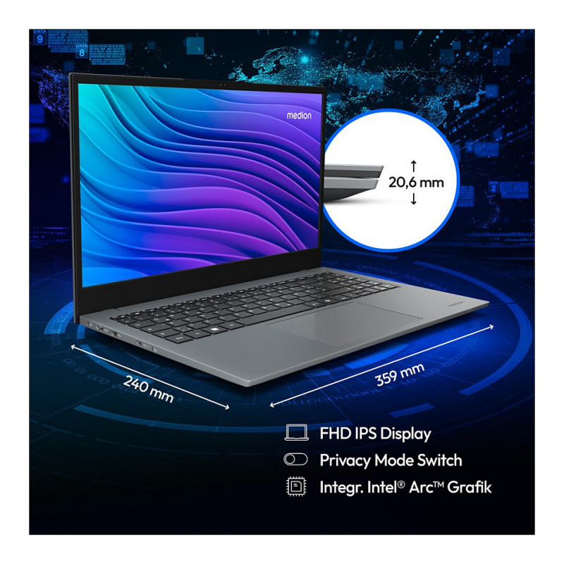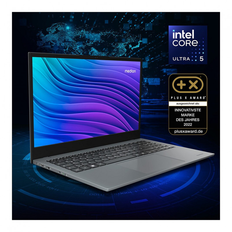 "MEDION E15443. Product type: Laptop, Form factor: Clamshell. Processor family: Intel Core Ultra 5, Processor model: 125H. Display diagonal: 39.6 cm (15.6""), HD type: Full HD, Display resolution: 1920 x 1080 pixels. Internal memory: 16 GB, Internal memory type: DDR5-SDRAM. Total storage capacity: 512 GB, Storage media: SSD. On-board graphics card model: Intel Arc Graphics. Operating system installed: Windows 11 Home. Product colour: Grey"\n