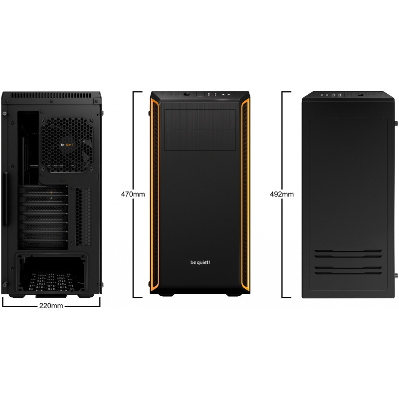 "be quiet! Pure Base 600 Window. Form factor: Midi Tower, Type: PC, Product colour: Black, Orange. Power supply location: Bottom, Supported power supply form factors: ATX. Front fans installed: 1x 140 mm, Front fans diameters supported: 120,140 mm, Rear fans installed: 1x 120 mm. Supported HDD sizes: 2.5,3.5"". Width: 220 mm, Depth: 492 mm, Height: 470 mm"\n"Exceptionally silent and functional
