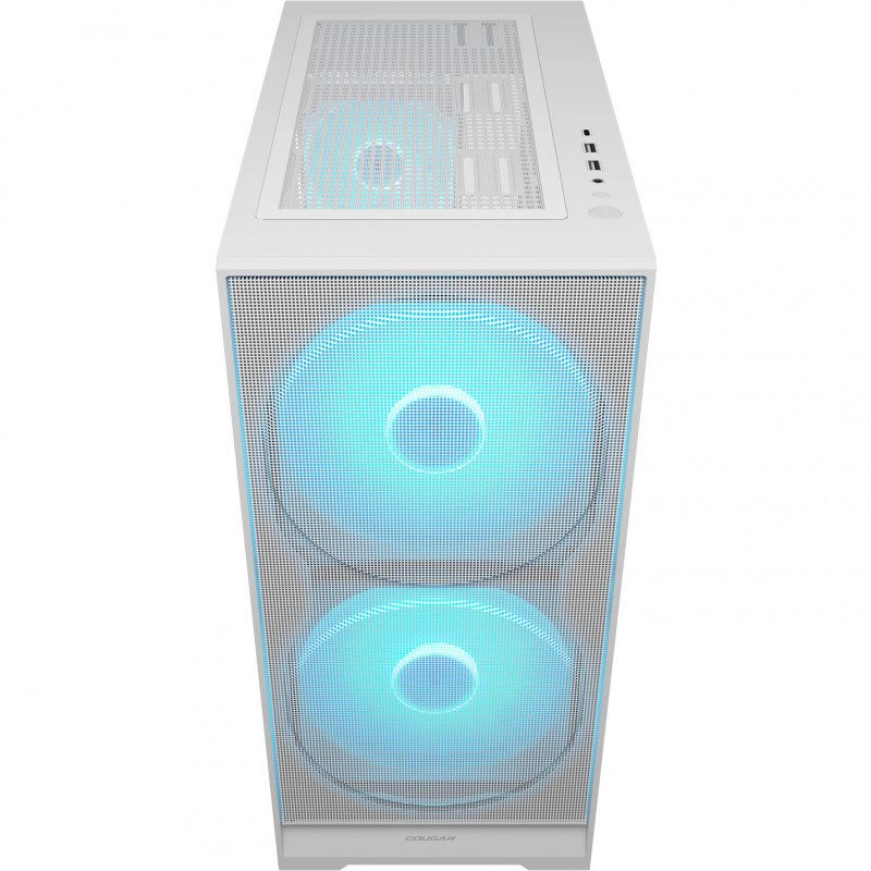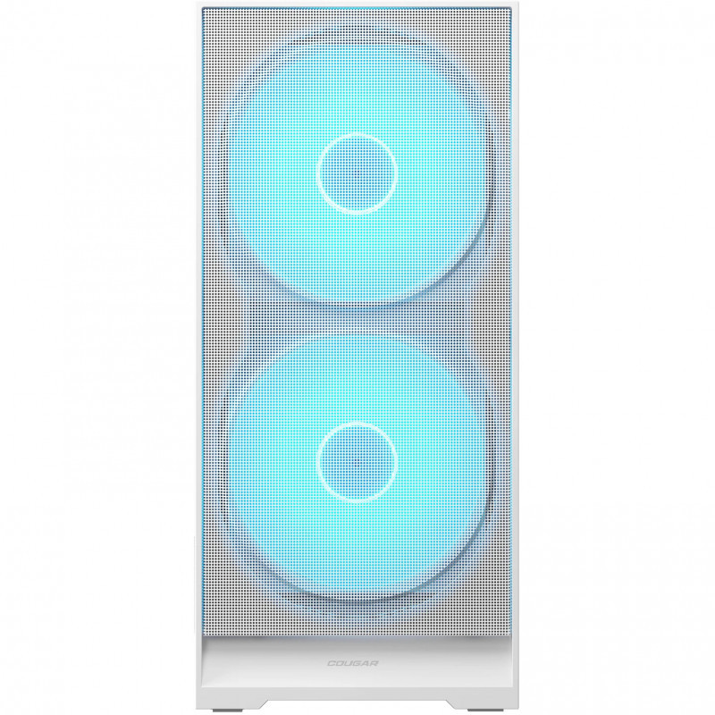"COUGAR Midi Tower Case, Airface 180, ARGB, White. Form factor: Midi Tower, Type: PC, Product colour: White. Power supply location: Bottom. Front fans installed: 2x 180 mm, Front fans diameters supported: 120,140,180 mm, Rear fans installed: 1x 120 mm. Supported HDD sizes: 2.5,3.5"". Width: 220 mm, Depth: 410 mm, Height: 483 mm"\n"The Power of 180mm, Doubled.