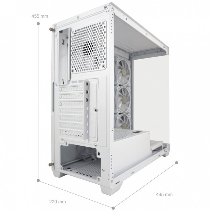"LC-Power LC-715W-ON. Form factor: Midi Tower, Type: PC, Product colour: White. Power supply location: Rear, Supported power supply form factors: ATX. Rear fans diameters supported: 120 mm, Top fans diameters supported: 120,140 mm, Bottom fans diameters supported: 120 mm. Width: 220 mm, Depth: 445 mm, Height: 455 mm"\n"Experience the gaming case 715B from LC-Power! Seamless_X offers you a lot of features and a great variety of system configurations for ATX, Micro ATX and Mini ITX systems!"