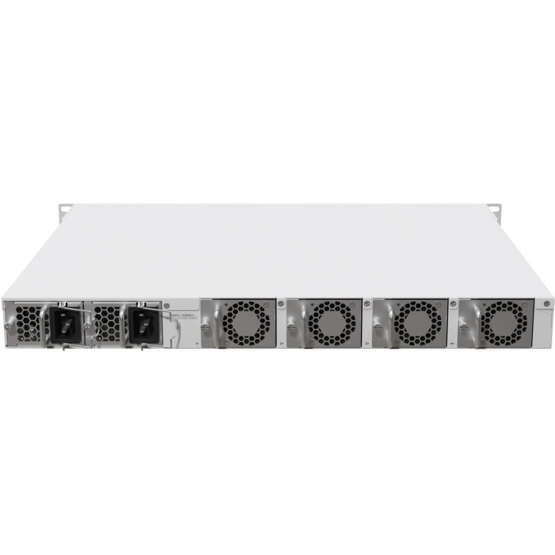 There are 2x QSFP28 cages for blazing-fast 100 Gigabit connectivity, 12x SFP28 cages for 25 Gigabit networking, and a Gigabit Ethernet port. The device comes with 16 GB of RAM, decent NAND storage, and two M.2 SATA slots for additional storage. There are four hot-swappable fans, as well as dual-redundant hot-swap power supplies. And these PSUs might look familiar if you have used our CCR1072 before: you can keep using your previous hot-swap power supplies and SFP modules.