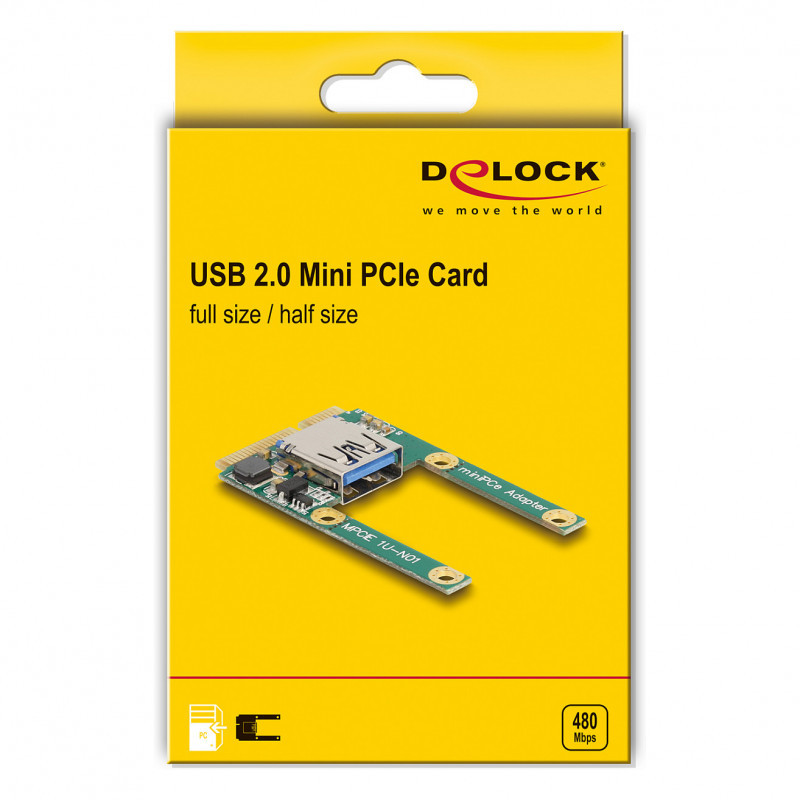 "DeLOCK Mini PCIe I/O 1 x USB 2.0 Type-A female full size / half size. Host interface: Mini PCI Express, Output interface: USB 2.0, Host interface gender: Male. Product colour: Green, Purpose: PC, Country of origin: China. Data transfer rate (max): 0.48 Gbit/s. Output voltage: 5 V, Output current: 0.5 A. Width: 30 mm"\n"This Mini PCIe module by Delock expands your system by one USB 2.0 port. You can connect different USB devices like e.g. USB WLAN stick, USB memory etc. The module can be cut from full size to half size at the marked position."