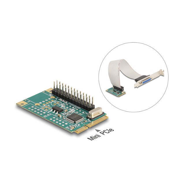 "DeLOCK 95275. Host interface: Mini PCI Express, Output interface: Parallel. Product colour: Green, Country of origin: China. Connector 1 gender: Female, Connector 1 form factor: Straight. Windows operating systems supported: Windows 10, Windows 10 x64, Windows 11, Linux operating systems supported: Linux Kernel 6.5, Server operating systems supported: Windows Server 2022. Width: 30 mm, Depth: 51 mm, Height: 10 mm"\n"This Mini PCIe card by Delock expands a PC by one external parallel port. Different devices such as scanner, printer etc. can be connected to this card."