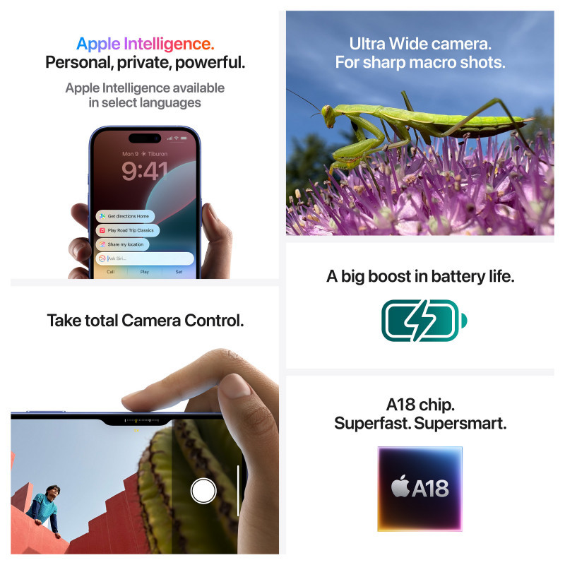 "Apple iPhone 16 128GB Pink. Display diagonal: 15.5 cm (6.1""), Display resolution: 2556 x 1179 pixels. Processor family: Apple, Processor model: A18. Internal storage capacity: 128 GB. Rear camera resolution (numeric): 48 MP, Rear camera type: Dual camera. SIM card capability: Dual SIM. Operating system installed: iOS 18. Product colour: Pink. Weight: 170 g"\n"iPhone 16