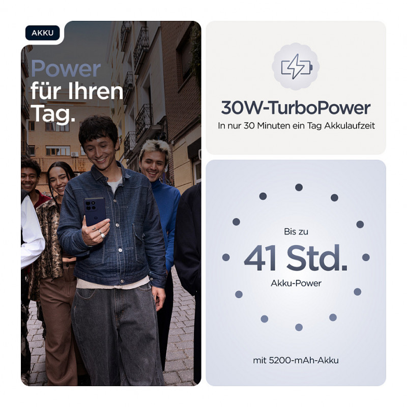 For those who push the boundaries in life, introducing moto g86 5G. Beautifully crafted from premium materials, it stands out with a bold design featuring advanced water and drop protection(6,7). View everything on an ultra-bright 6.67"" Super HD (1220p) display backed by Dolby Atmos® sound. Capture stunning photos with the 50MP Sony LYTIA™ 600 camera powered by moto ai(12), and effortlessly shoot like a pro. Get over 41 hours of battery life in just minutes of TurboPower™ charging(1,13). Feel the power of an advanced processor and 8GB—expandable to 24GB with RAM Boost—and up to 256GB of storage(3,9). And empower your creative freedom, effortless interactions, and peace of mind with exclusive Moto experiences. Embrace life’s adventures with moto g86 5G."