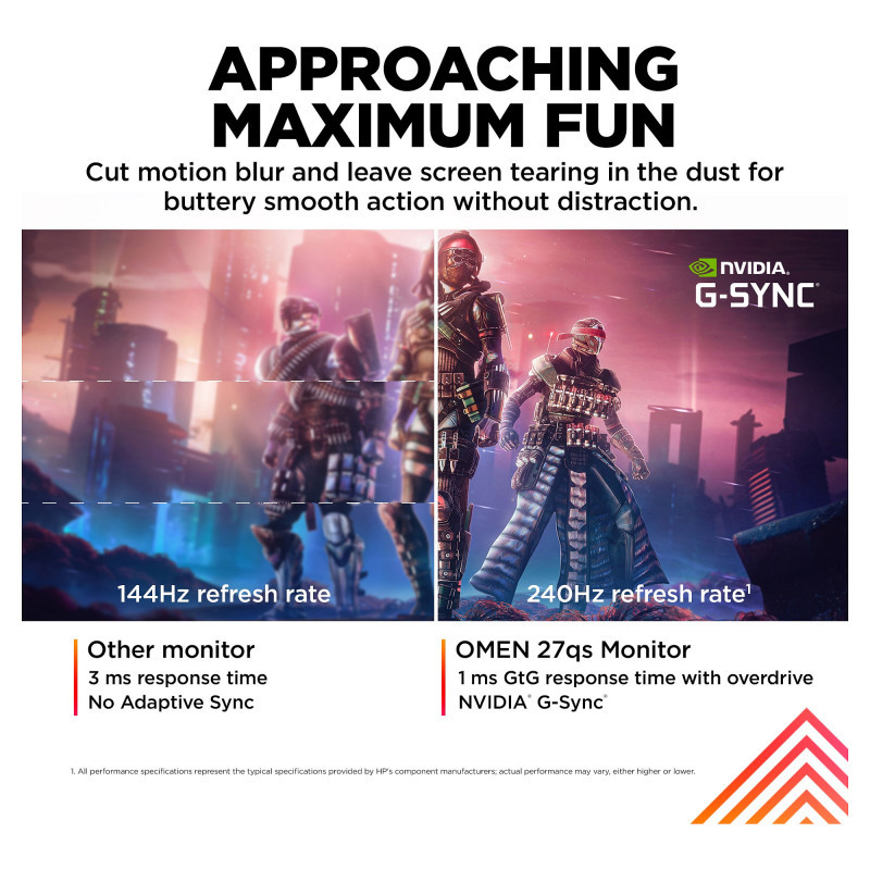 Outclass the competition with the OMEN by HP 27-inch QHD 240Hz Gaming Monitor. Delivering ultra-smooth frames and crisp details[1], this NVIDIA® G-SYNC® compatible display has what it takes to keep up with you. Speed meets looks with a fun, yet refined design unlike any other so you can enjoy it in and out of the game."