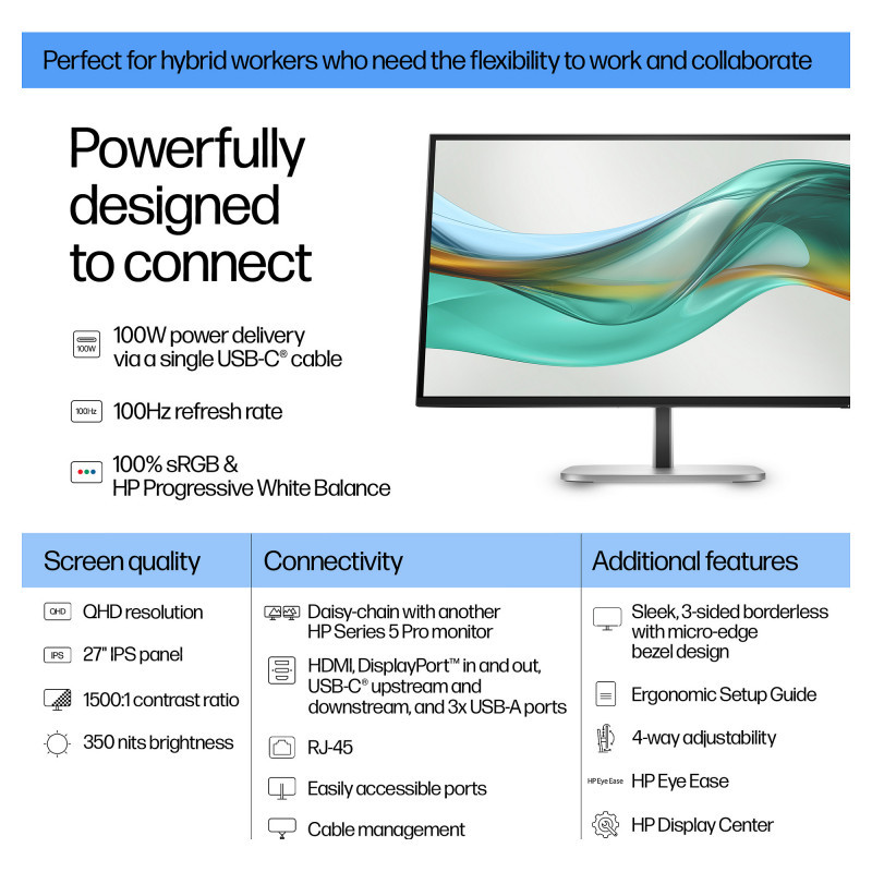 "HP Series 5 Pro 27 inch QHD USB-C Monitor - 527pu. Display diagonal: 68.6 cm (27""), HD type: Quad HD, Display technology: LCD, Display surface: Matt, Response time: 5 ms, Native aspect ratio: 16:9, Viewing angle, horizontal: 178°, Viewing angle, vertical: 178°. Built-in USB hub, USB hub version: 3.2 Gen 1 (3.1 Gen 1). VESA mounting, Height adjustment. Product colour: Black"\n"Powerfully designed to connect