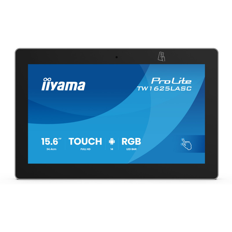 "iiyama TW1625LASC-B3PNR. Display diagonal: 39.6 cm (15.6""), Display resolution: 1920 x 1080 pixels, Display technology: LED. Housing colour: Black, Panel mounting interface: 75 x 75 mm, Certification: CE, EAC, RoHS support, ErP, WEEE, REACH, UKCA. Processor manufacturer: ARM, Processor family: ARM Rockchip, Operating system installed: Android. Wi-Fi standards: 802.11a, 802.11b, 802.11g, Wi-Fi 4 (802.11n), Wi-Fi 5 (802.11ac), Wi-Fi 6 (802.11ax). Package width: 495 mm, Package depth: 495 mm, Package height: 305 mm"\n"The ProLite TW1625LASC-B3PNR is a smart and intuitive 15.6"" touch panel PC, designed for high-traffic environments such as meeting rooms, info points, or hospitality spaces. Its 10-point PCAP touch technology with Optical Bonding ensures smooth and precise interaction with reduced glare, while protecting the display from humidity and moisture build-up. Powered by Android 14, and equipped with powerful hardware, it allows easy installation of apps directly on the device - making it a all-in-one solution. Thanks to Power over Ethernet (PoE), both power and data are delivered through a single cable, simplifying installation and reducing additional cables. The integrated NFC/RFID reader enables contactless interaction with compatible tags or devices – ideal for quick check-in to rooms, employee authentication or triggering automated actions such as starting a presentation. The RGB LED bar integrated into the bezel shows the availability of rooms at a glance. With a built-in 5MP camera, microphone, and speakers, the TW1625LASC-B3PNR delivers seamless, modern interaction in any smart space. Additionally, it integrates effortlessly with iiSignage² , iiyama’s Content Management System (CMS), giving you full control over your messages and advertising, in landscape portrait and face-up position."
