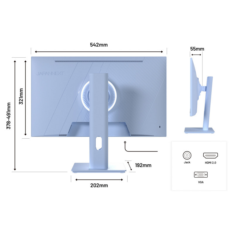 "JAPANNEXT JN-I238FHD120F-HSP-BB. Display diagonal: 60.5 cm (23.8""), Display resolution: 1920 x 1080 pixels, HD type: Full HD, Display technology: LCD, Display surface: Matt, Response time: 0.5 ms, Native aspect ratio: 16:9, Viewing angle, horizontal: 178°, Viewing angle, vertical: 178°. Built-in speaker(s). VESA mounting, Height adjustment. Product colour: Blue"\n"It is said that this monitor is as refreshing as a summer sky. Its light blue brings a touch of smoothness to your desktop, while its 120 Hz and fast response time ensure a smooth gaming experience. Ideal to combine style and efficiency!
