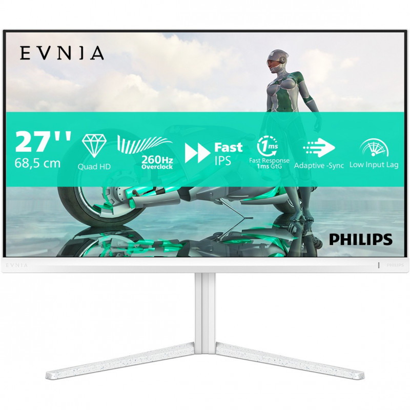 "Philips Evnia 27M2N3501PA/00. Display diagonal: 68.6 cm (27""), Display resolution: 2560 x 1440 pixels, HD type: Quad HD, Display technology: LCD, Response time: 1 ms, Native aspect ratio: 16:9, Viewing angle, horizontal: 178°, Viewing angle, vertical: 178°. Built-in speaker(s). VESA mounting, Height adjustment. Product colour: White"\n"This 27-inch Fast IPS monitor brings sharp visuals to gaming. With its overclockable 260Hz refresh rate and 0.3ms Smart MBR, you can expect clear visuals and a high-quality all-around gaming experience."