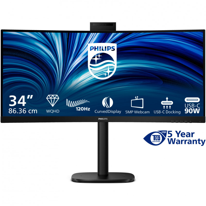 "Philips 3000 series 34B2U3600CH/00. Display diagonal: 86.4 cm (34""), Display resolution: 3440 x 1440 pixels, HD type: Wide Quad HD, Display technology: LCD, Response time: 4 ms, Native aspect ratio: 21:9, Viewing angle, horizontal: 178°, Viewing angle, vertical: 178°. Built-in speaker(s). Built-in USB hub, USB hub version: 3.2 Gen 1 (3.1 Gen 1). VESA mounting, Height adjustment. Product colour: Black"\n"With the Smart KVM switch, it is ideal for switching between sources without compromising on picture quality. Features like USB-C and pop-up webcam with Windows Hello deliver the performance and convenience you expect."