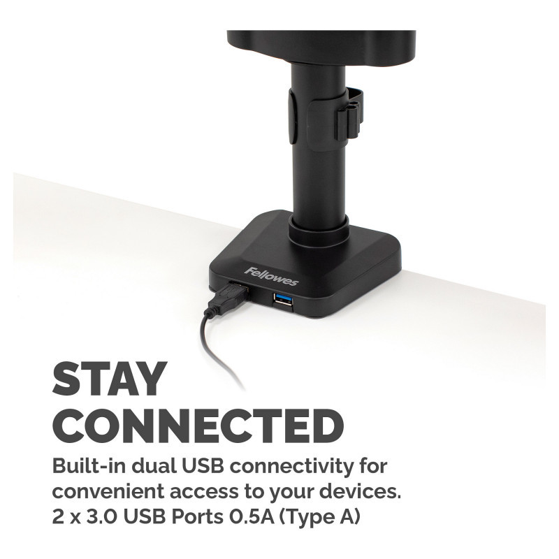 "Fellowes Platinum Series Triple Monitor Arm - Monitor Mount for Three 7KG 27 Inch Screens - Adjustable Triple Monitor Desk Mount - Tilt 45° Pan 180° Swivel 360° Rotation 360°, VESA 75 x 75/100 x 100 - Black. Mounting: Clamp/Grommet, Maximum weight capacity: 7 kg, Maximum screen size: 76.2 cm (30""), Minimum VESA mount: 75 x 75 mm, Maximum VESA mount: 100 x 100 mm. Tilt angle range: -45 - 45°. Product colour: Black"\n"Sitting or standing with bad posture all day using a computer is bad for your health. Leaning forwards or tilting your head up or down not only causes back and neck strain but is also bad for your eyes. The Fellowes Platinum Series triple monitor stand will improve your ergonomic posture and reduce back neck and eye strain. Triple screen working means you can view more screen content and can use multiple programs simultaneously. With ever shrinking office spaces, using an adjustable monitor stand means you can free up valuable work space to become more organised and productive. With effortless adjustment you can collaborate and share information with colleagues easily, making them ideal for hot desks or shared desks. This fully independent adjustable monitor stand by Fellowes can pan 180 Degree, tilt +/-45° (90°) and can rotate 360° via gas spring technology allowing for effortless movement. Built in dual USB connectivity and intuitive cable management allows you to stay connected and minimise clutter at the same time with the Fellowes Platinum Series triple monitor mount. Easily mounted via clamp or grommet, each arm holds a monitor up to 7kg (up to 27-Inch monitors) and meets VESA monitor standards."