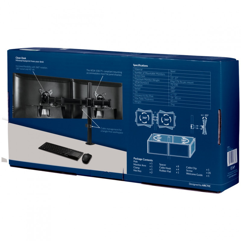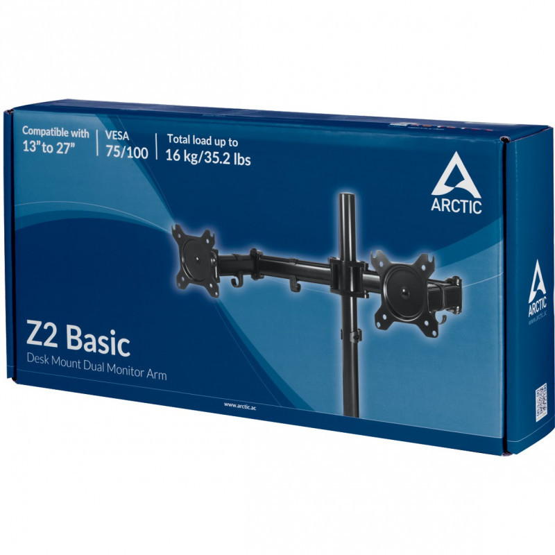 "ARCTIC Z2 Basic. Mounting: Clamp, Maximum weight capacity: 16 kg, Minimum screen size: 33 cm (13""), Maximum screen size: 68.6 cm (27""), Minimum VESA mount: 75 x 75 mm, Maximum VESA mount: 100 x 100 mm. Tilt angle range: -15 - 15°. Product colour: Black"\n"Z2 Basic