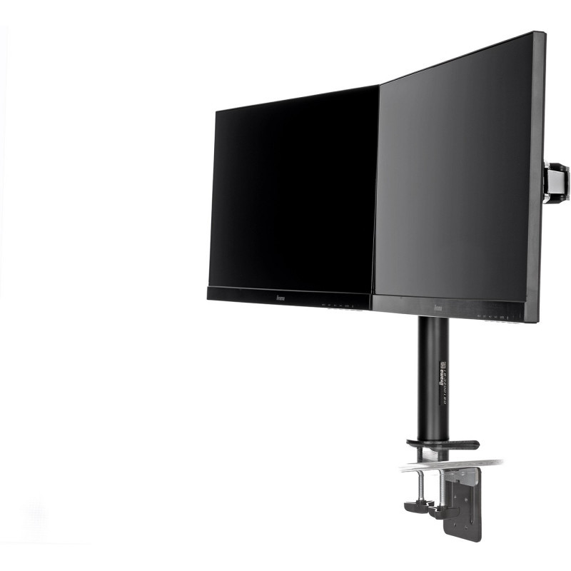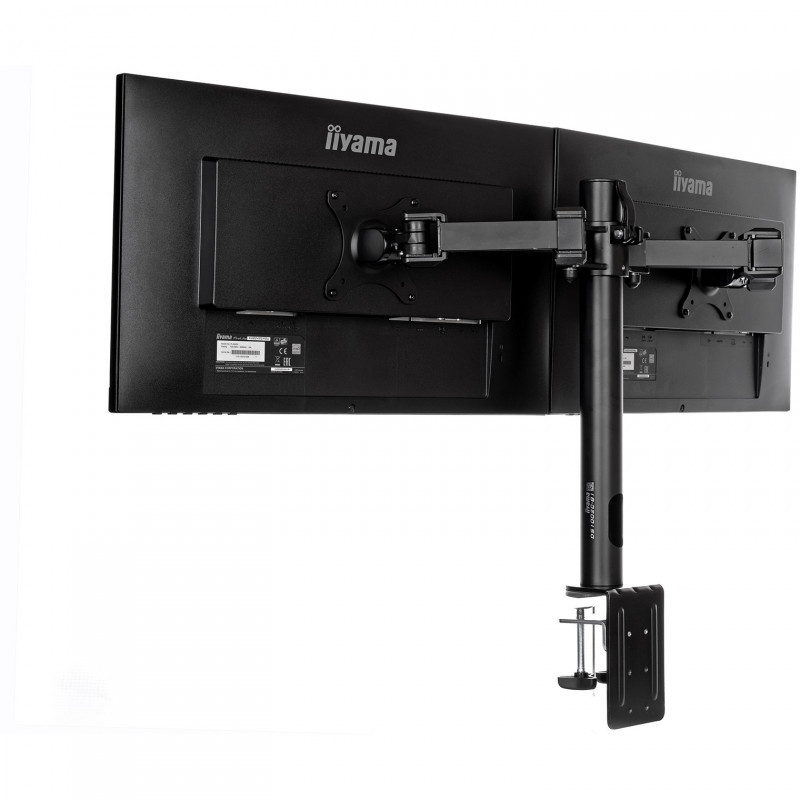 "iiyama Simple and functional dual desktop arm. Mounting: Clamp, Maximum weight capacity: 10 kg, Minimum screen size: 25.4 cm (10""), Maximum screen size: 76.2 cm (30""), Minimum VESA mount: 75 x 75 mm, Maximum VESA mount: 100 x 100 mm. Height adjustment, Tilt angle range: -85 - 15°. Product colour: Black"\n"The iiyama DS1002C-B1 is a desk mount (clamp) for two flat screens up to 30”. Thanks to the arm you can save space on your desk and the cable management system helps to keep your workplace tidy. Broad adjustment capabilities, including tilt, swivel, height and rotation, the arm offers, allow you to easily adjust the position of the screens to your preferences assuring comfortable and healthy body posture."