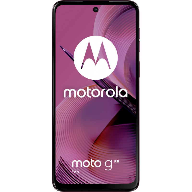 "Motorola moto g55 5G. Display diagonal: 16.5 cm (6.49""), Display resolution: 2400 x 1080 pixels. Processor frequency: 2.5 GHz, Processor family: MediaTek Dimensity, Processor model: 7025. RAM capacity: 8 GB, Internal storage capacity: 256 GB. Rear camera resolution (numeric): 50 MP, Rear camera type: Dual camera. SIM card capability: Dual SIM. Operating system installed: Android 14. Battery capacity: 5000 mAh. Product colour: Purple. Weight: 182 g"\n"Engineered to entertain