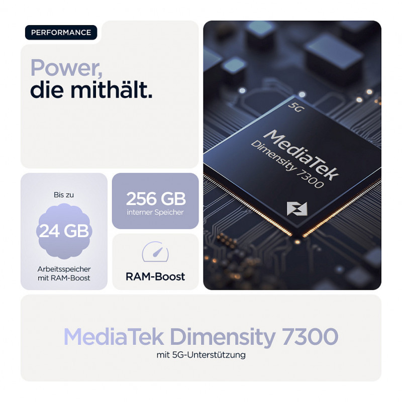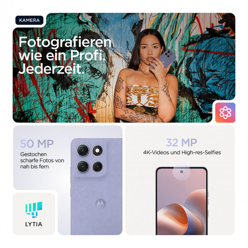 "Motorola moto g86 5G . Display diagonal: 16.9 cm (6.67""), Display resolution: 2712 x 1220 pixels. Processor family: MediaTek Dimensity, Processor model: 7300. RAM capacity: 8 GB, Internal storage capacity: 256 GB. Rear camera resolution (numeric): 50 MP, Rear camera type: Dual camera. SIM card capability: Dual SIM. Operating system installed: Android 15. Battery capacity: 5200 mAh. Product colour: Lilac. Weight: 185 g"\n"Bold design. Big adventures.