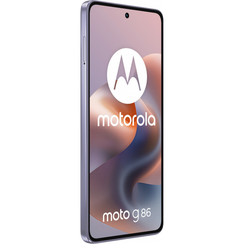 "Motorola moto g86 5G . Display diagonal: 16.9 cm (6.67""), Display resolution: 2712 x 1220 pixels. Processor family: MediaTek Dimensity, Processor model: 7300. RAM capacity: 8 GB, Internal storage capacity: 256 GB. Rear camera resolution (numeric): 50 MP, Rear camera type: Dual camera. SIM card capability: Dual SIM. Operating system installed: Android 15. Battery capacity: 5200 mAh. Product colour: Lilac. Weight: 185 g"\n"Bold design. Big adventures.