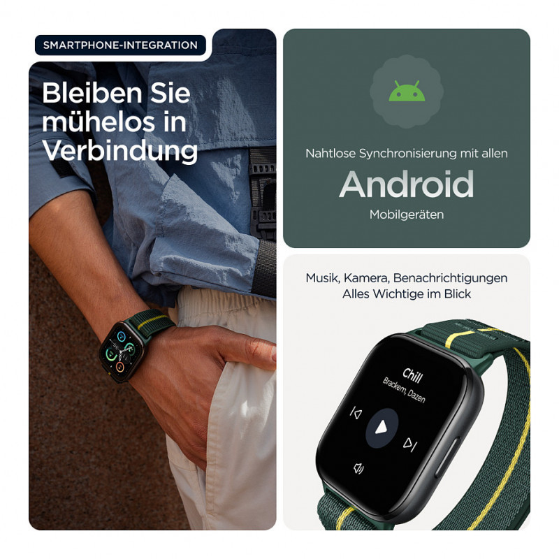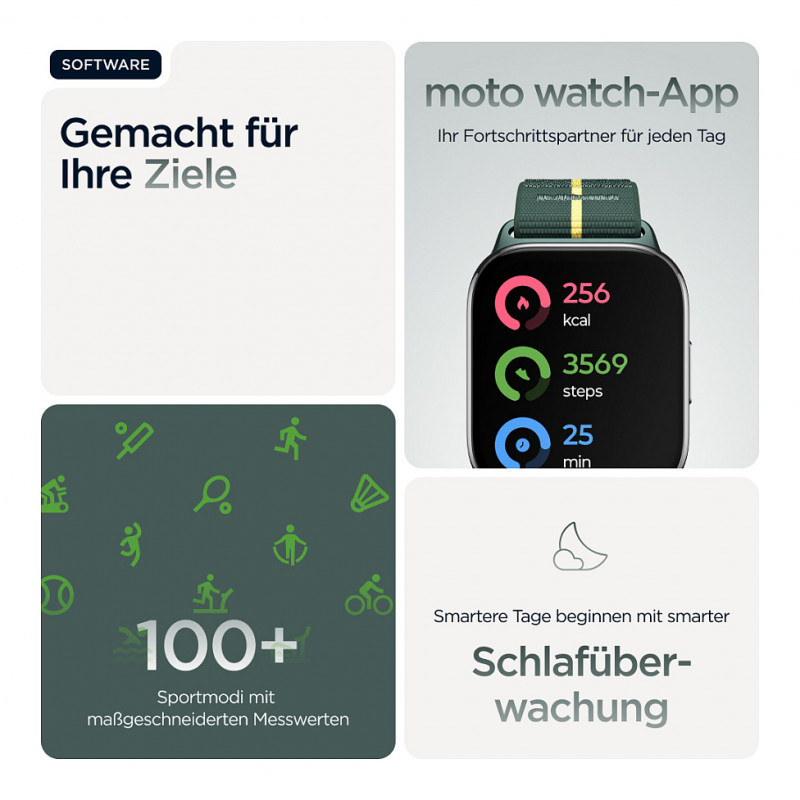 At last, a smartwatch that makes a fashion statement while helping you stay fit. Introducing moto watch fit. Get a big, bright 1.9"" OLED display to effortlessly interact with your stats and activities. Enjoy a sleek, modern design—ultrathin and light—and your choice of bands, in a Pantone® curated Trekking Green —or select from a growing number of compatible bands(1), plus a variety of watch faces.(2) Stay in control with seamless Android integration(2), whether skipping a song or receiving notifications. Improve performance with advanced fitness and health tracking. Keep your watch safe with IP68 underwater protection, a 5 ATM pressure rating, and Corning® Gorilla® Glass 3.(3) And get up to 16 days of battery life(4), so you can enjoy activities free from interruption. moto watch fit is smart in every sense."
